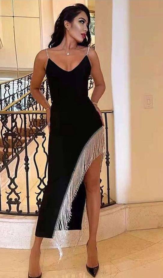Kadın Dagıç Kumaş Saçaklı Taşlı Askılı Midi Boy Elbise