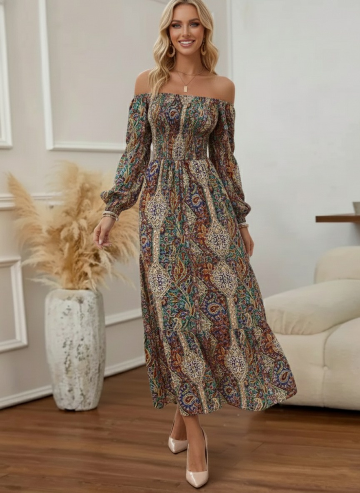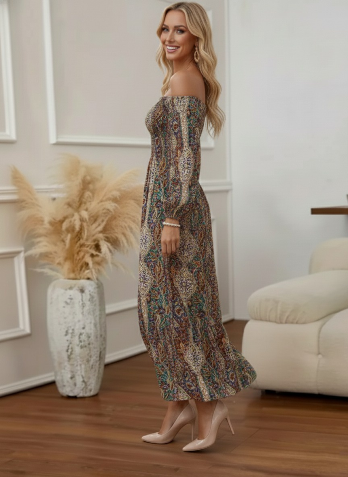 Kadın Düşük Omuzlu Beli Büzgülü Dijital Desenli Kesik Elyaf Süprem Uzun Elbise