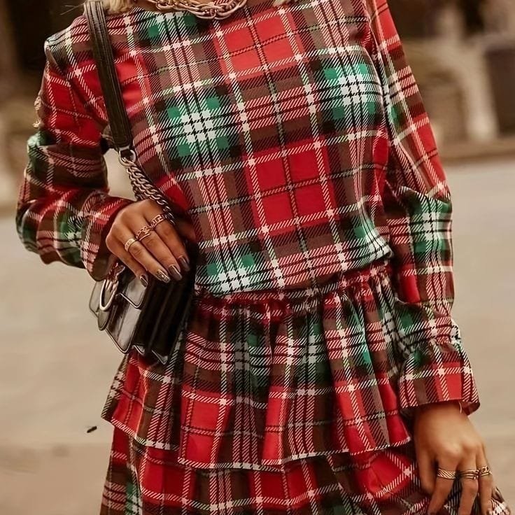 Kadın Ekose Kumaş Dijital Baskılı Uzun Kollu Mini Boy Elbise