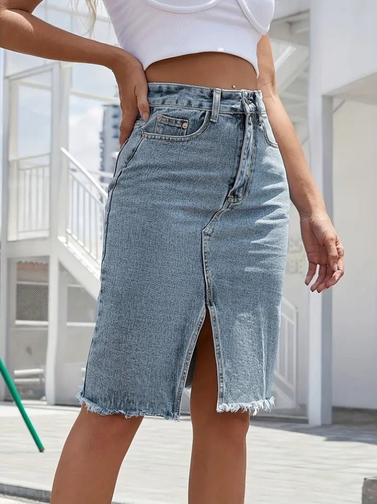 Kadın Elastik Bel Yırtık Kenar Detaylı Kot Etek
