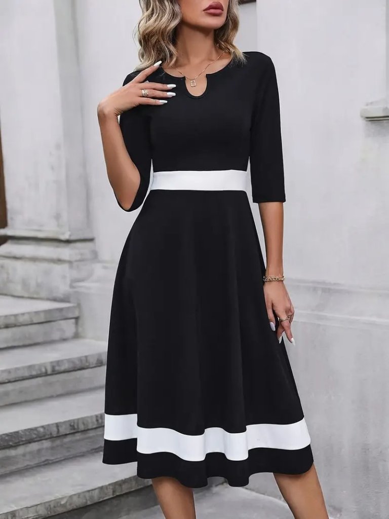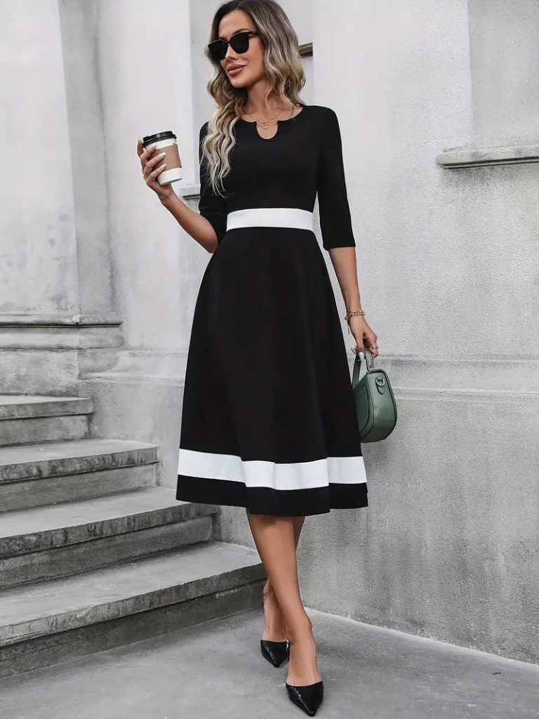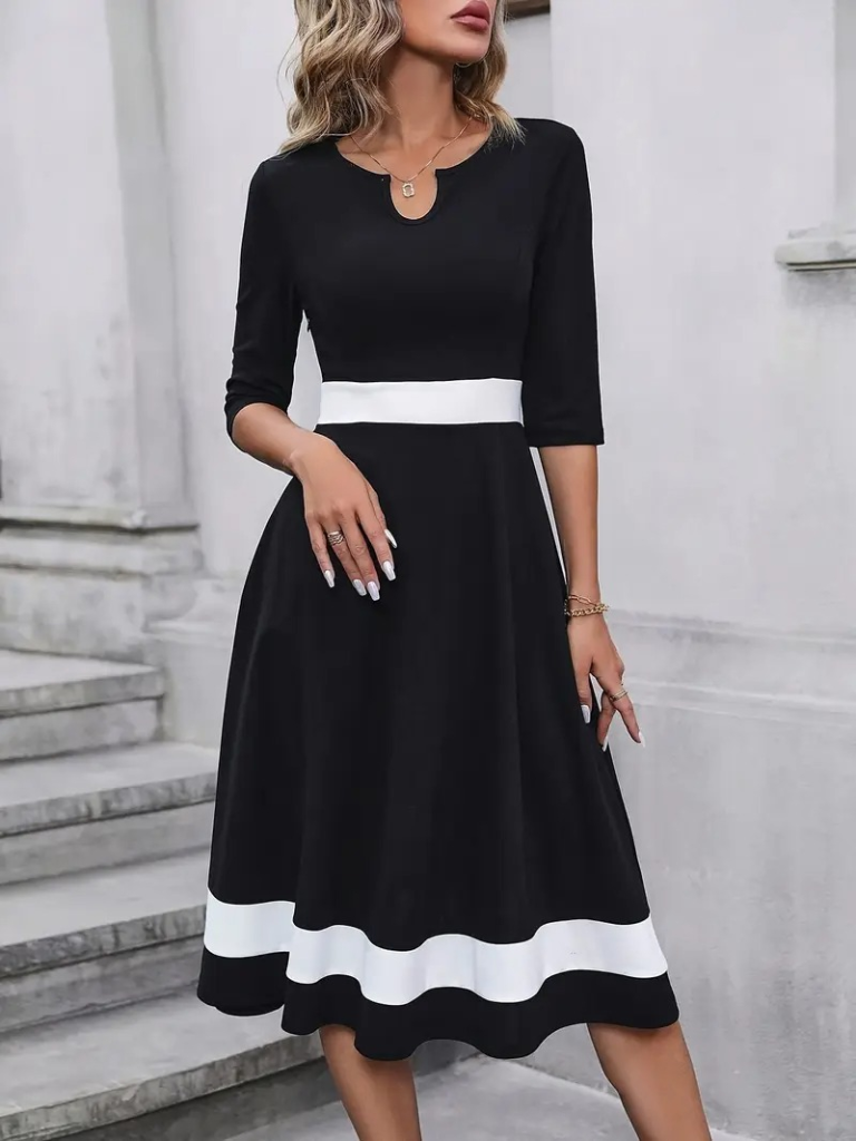 Kadın Fakir Kol Yakası Açık Blok Renkli Krep Midi Elbise
