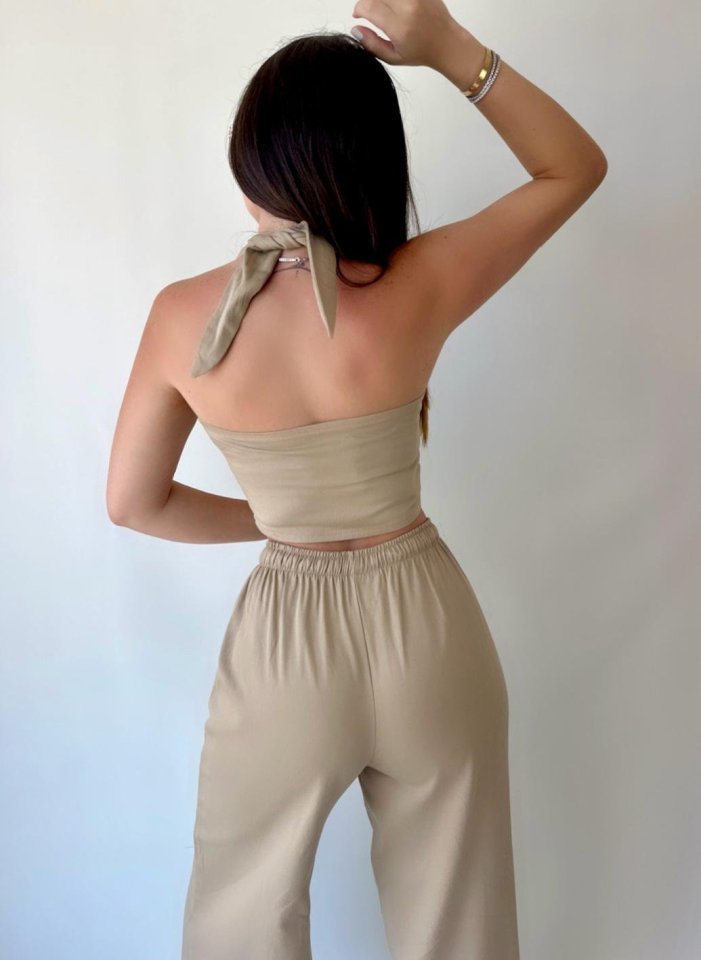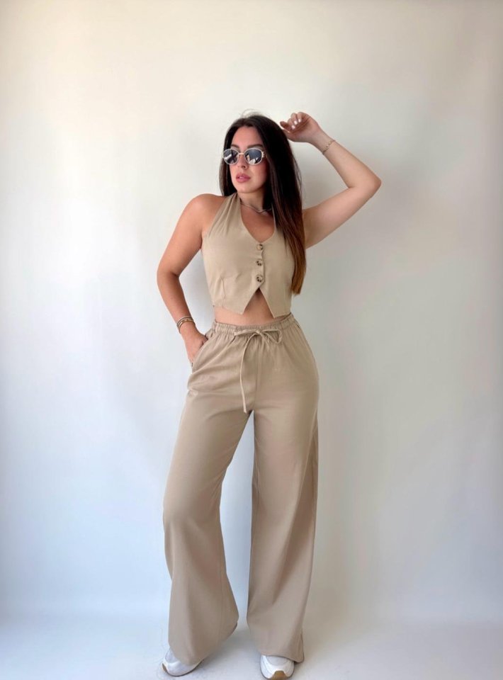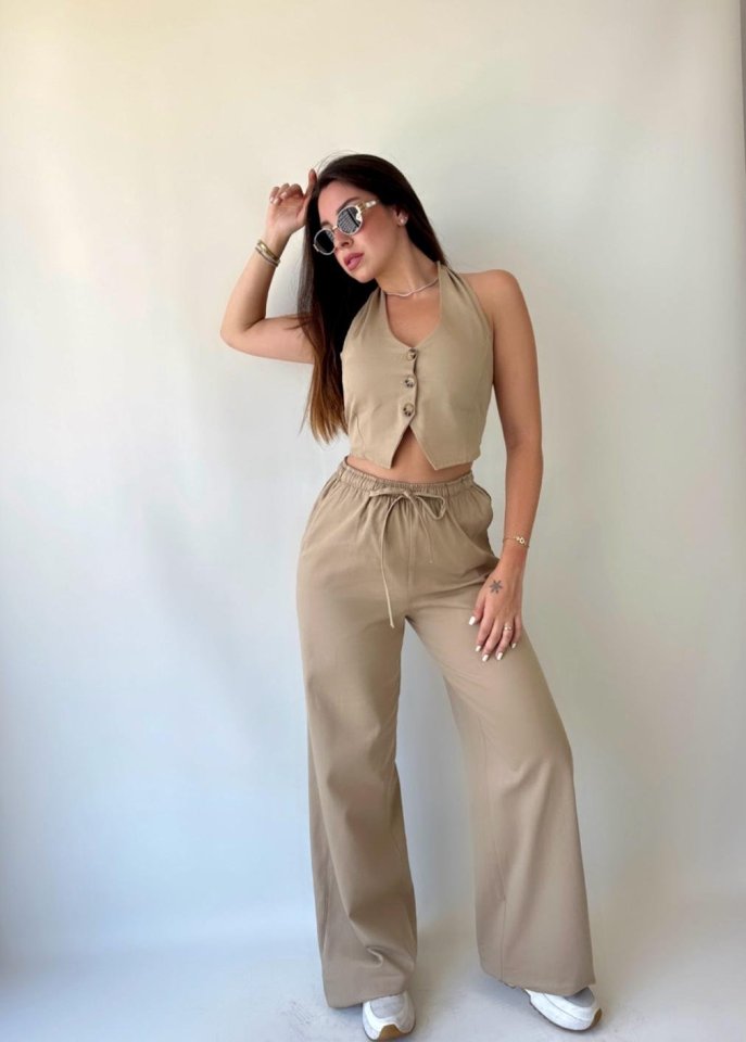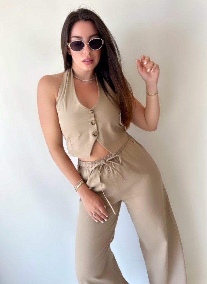 Kadın Gabardin Kumaş Boyundan Bağlamalı Yelek Bluz Salaş Pantolon İkili Takım