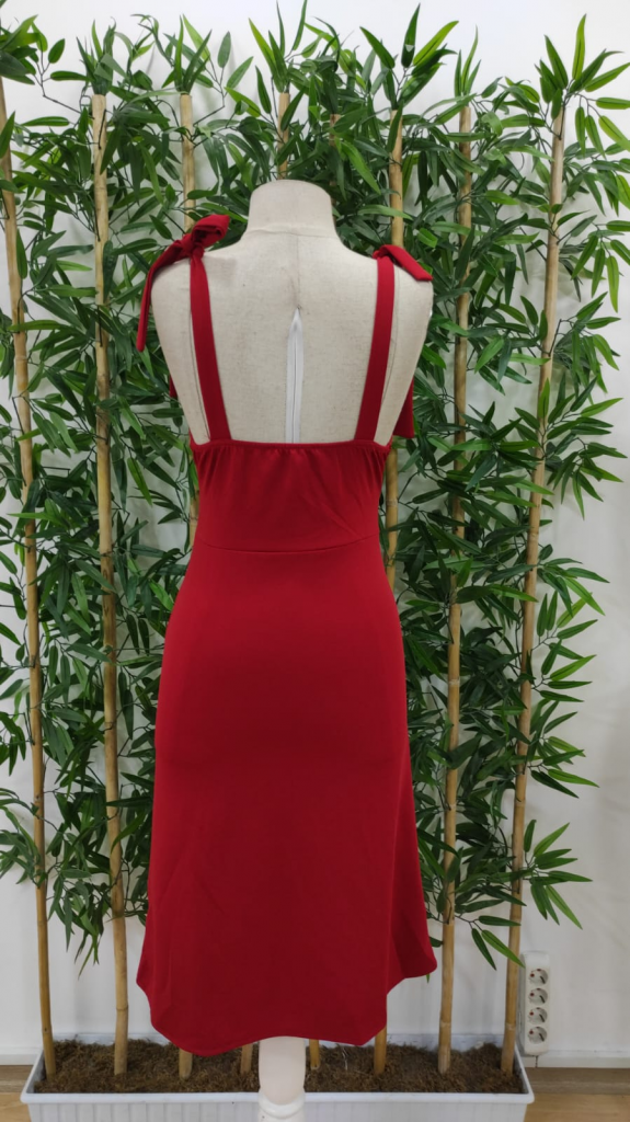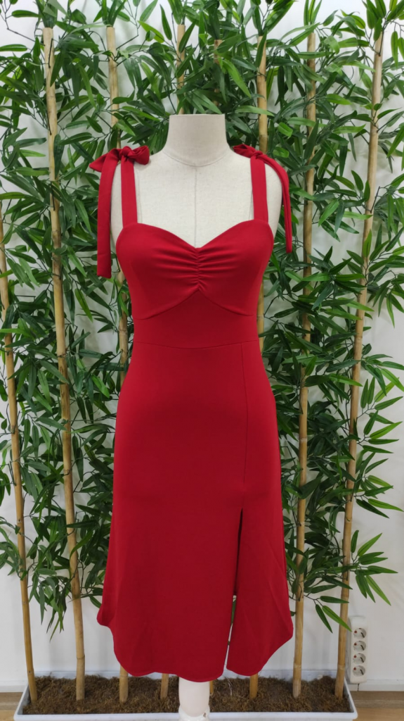 Kadın Göğüs Büzgü Detay Askıları Bağlamalı Yırtmaçlı Krep Elbise