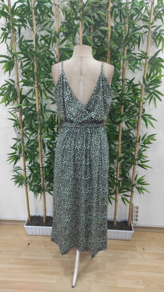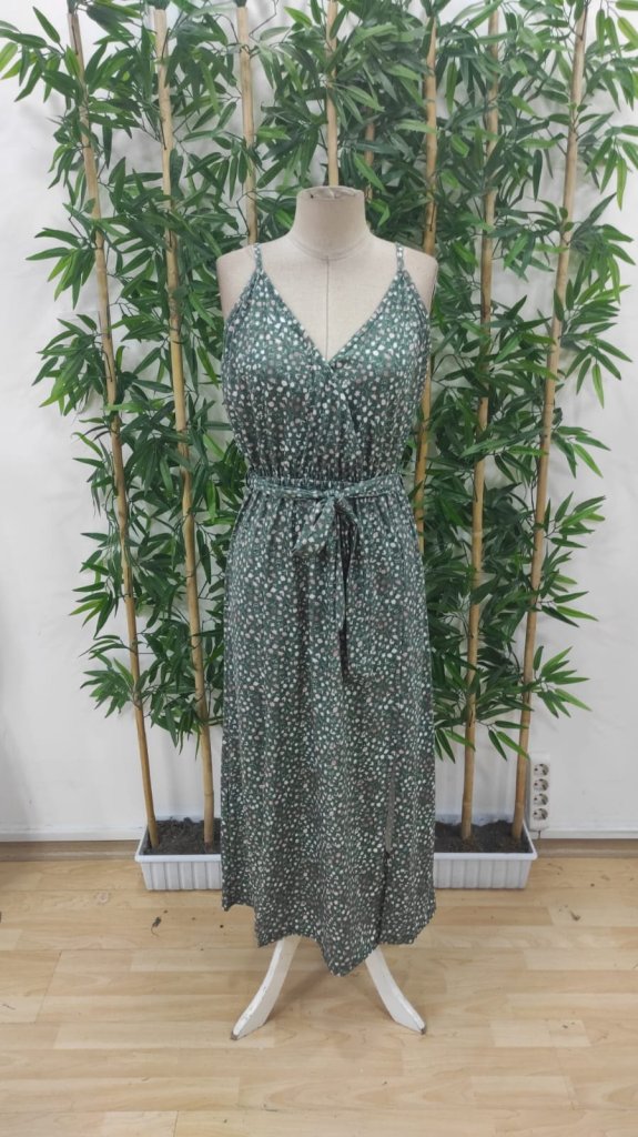 Kadın Ip Askılı Kruvaze Yakalı Yırtmaçlı Uzun Desenli Kuşaklı Süprem Elbise