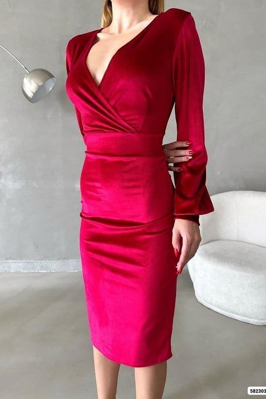 Kadın Kadife Kumaş Kruvaze Yaka Balon Kol Ve Yırtmaç Detaylı Midi Boy Elbise