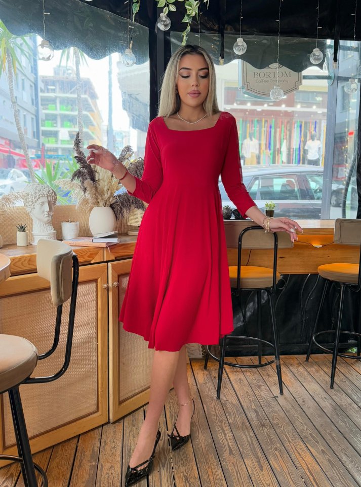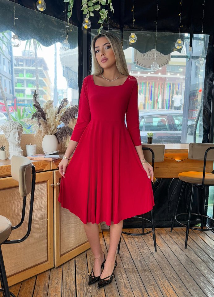 Kadın Kare Yaka Truvakar Kol Fırsat ürün Midi Boy Elbise