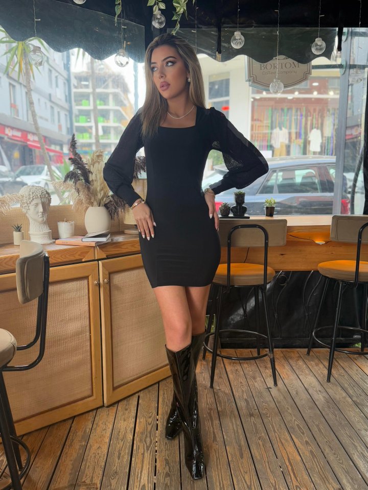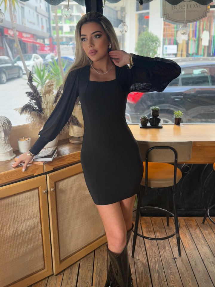 Kadın Kare Yaka Kolları Tül Sandy Kumaş Fırsat ürün Mini Siyah Elbise