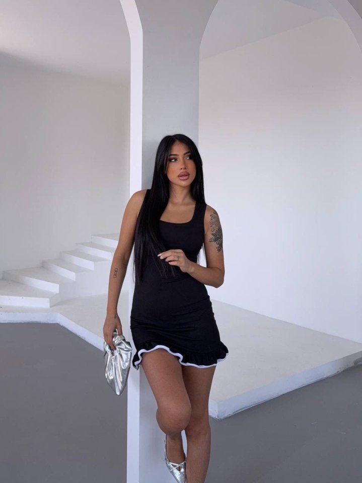 Kadın Kare Yaka Volan Detay Burgu Kumaş Mini Elbise