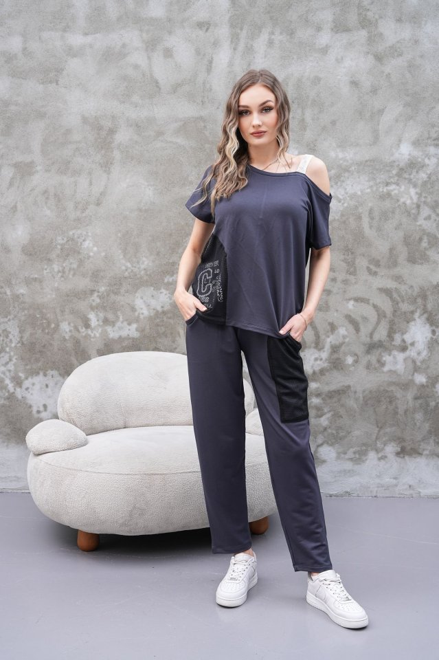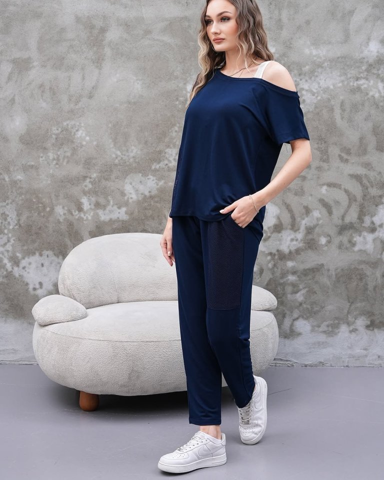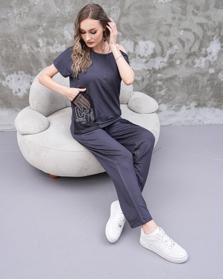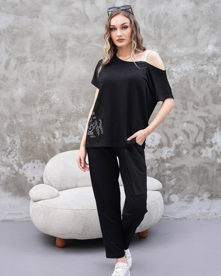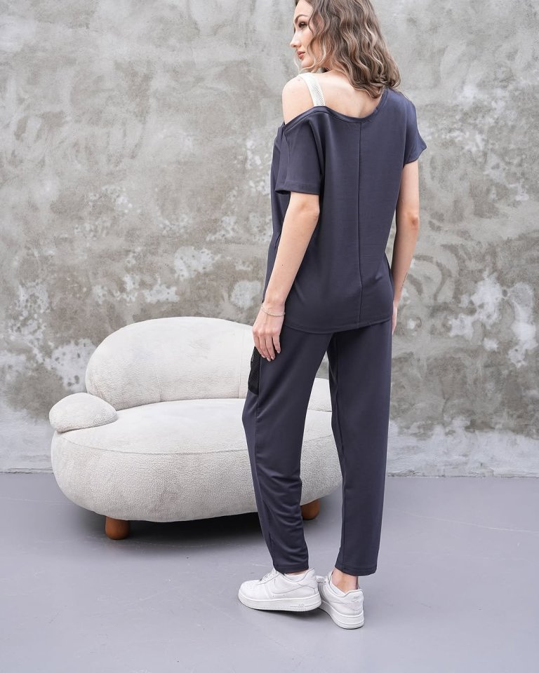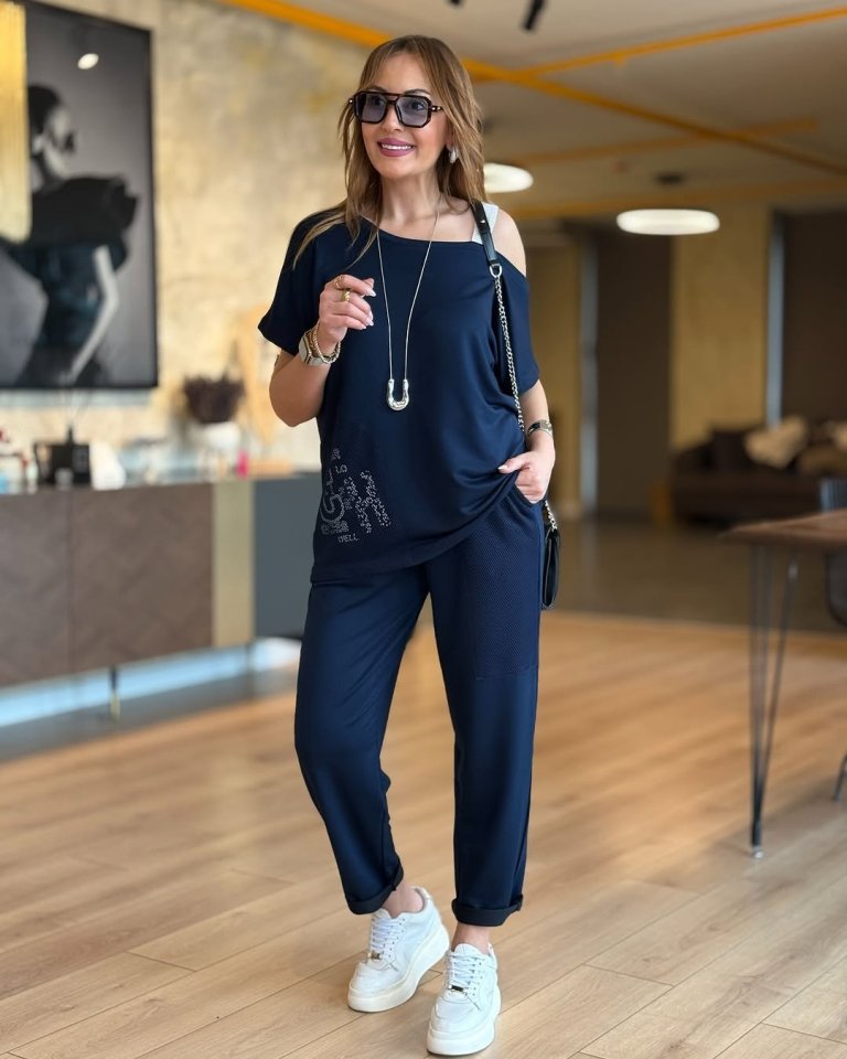 Kadın Kayık Yaka Baskı Detay Salaş Bluz Ve Yüksek Bel Pantolon Ikili Takım