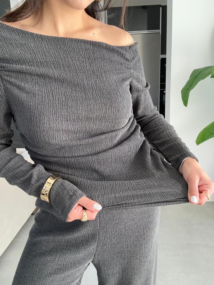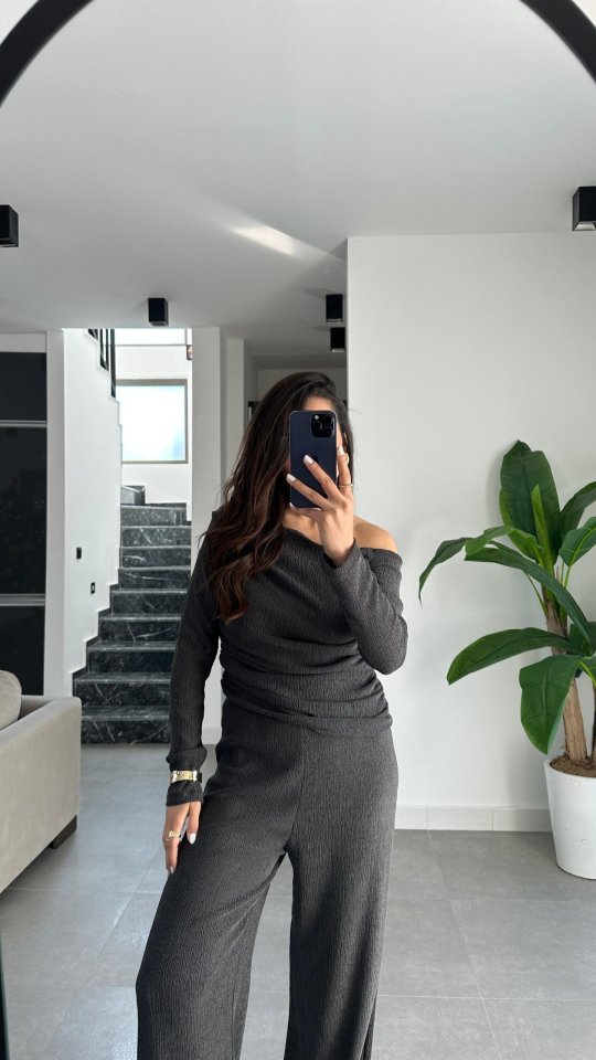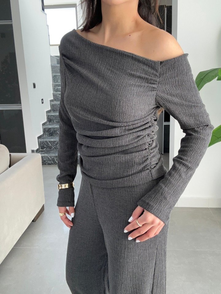 Kadın Kayık Yaka Yanı Büzgülü Omuz Dekolteli Bluz Vesalaş Ispanyol Paça Pantolon Ikili Takım