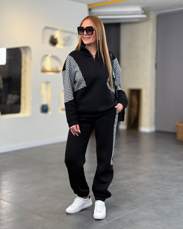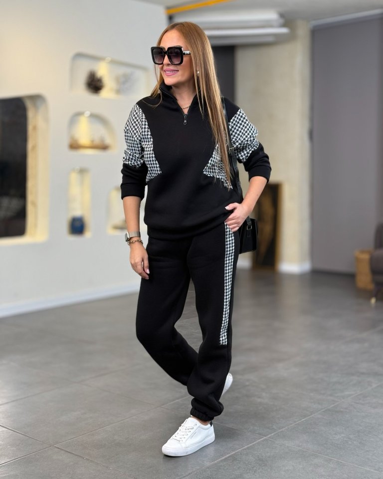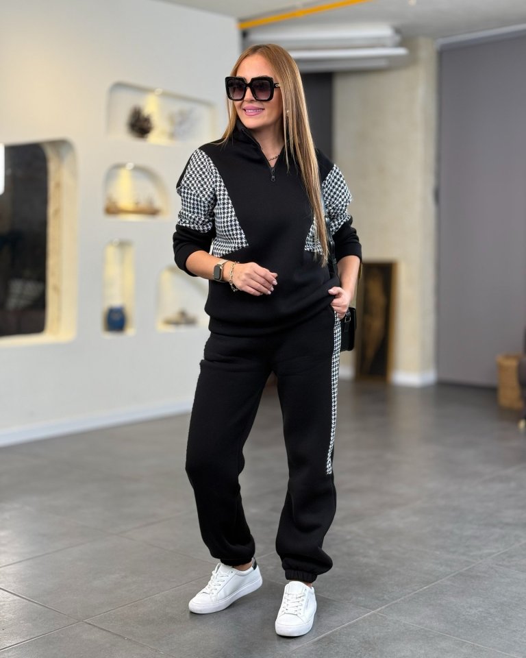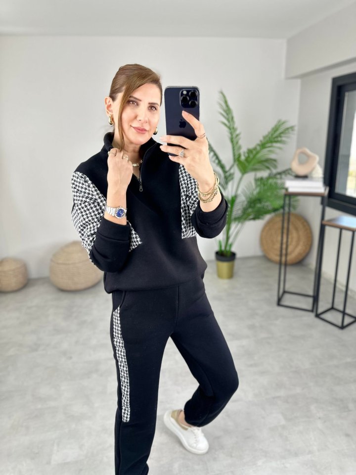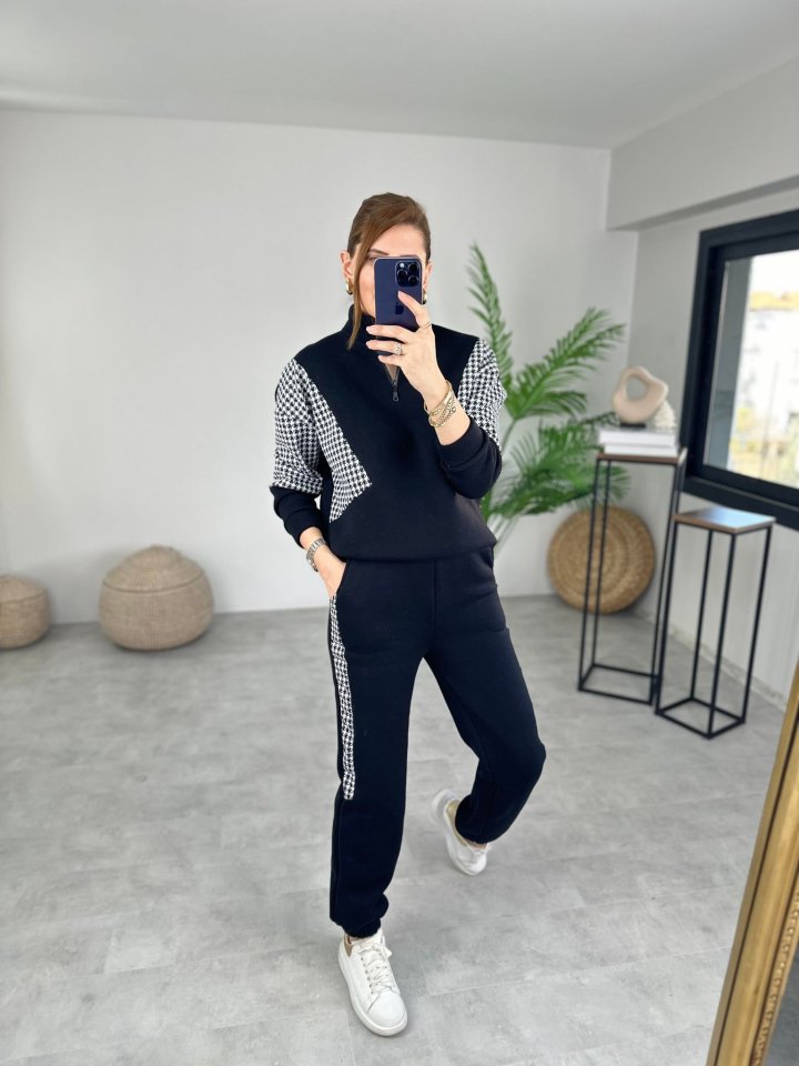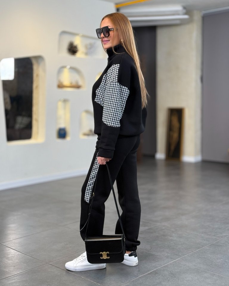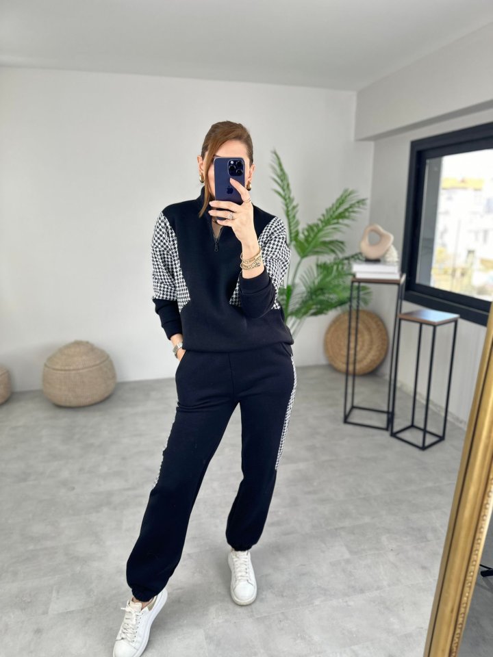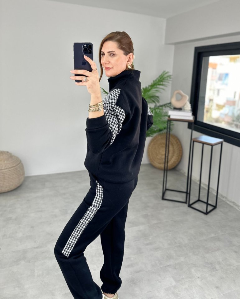 Kadın Kaz Ayağı Ve Fermuar Detay Boğazlı Kazak Ve Yanı şerit Detay Pantolon Ikili Takım