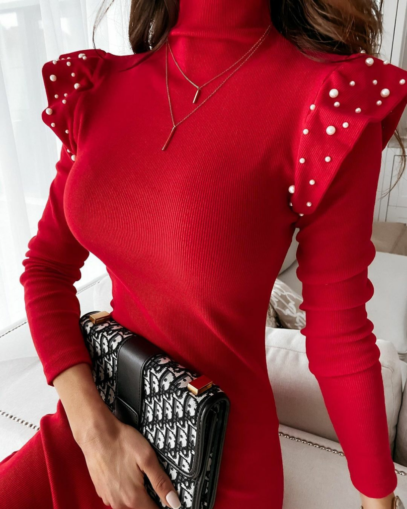 Kadın Kırmızı Uzun Kollu Balıkçı Yaka Omuzlarda Pile Inci Detay Kaşkorse Elbise
