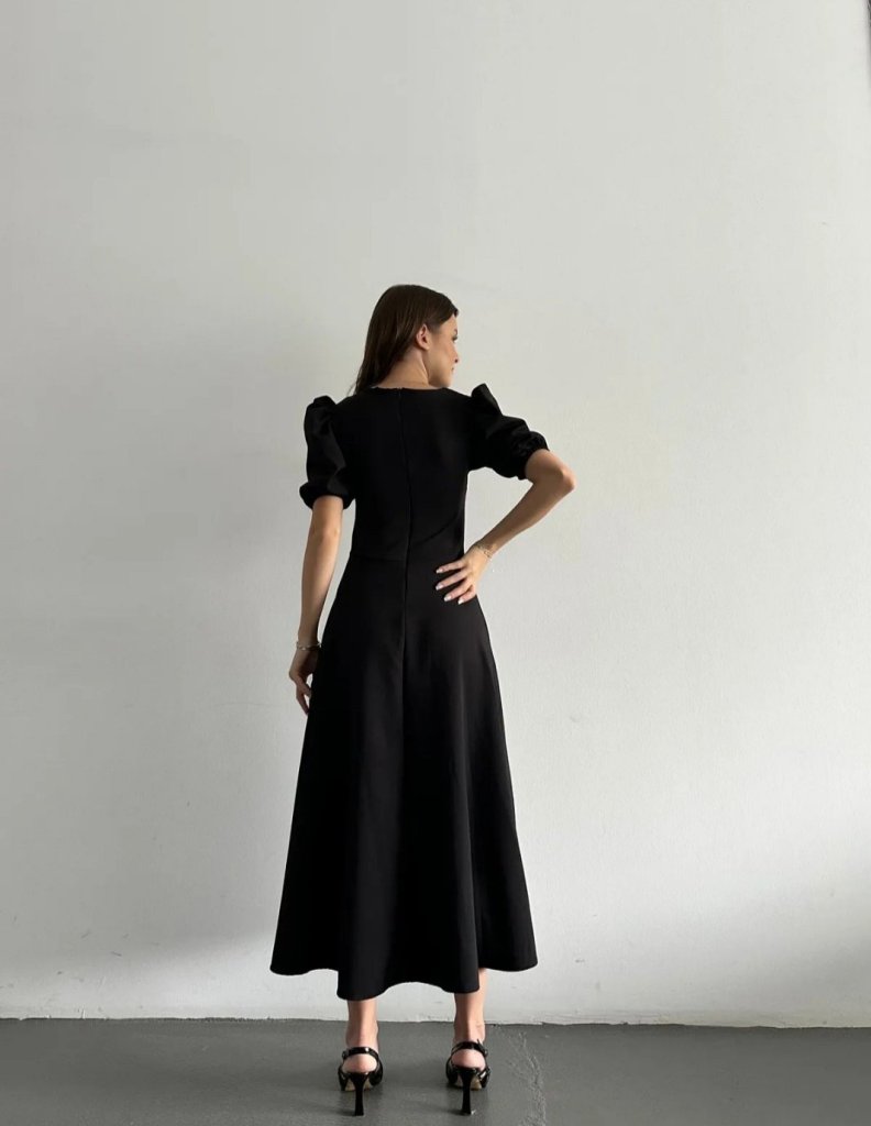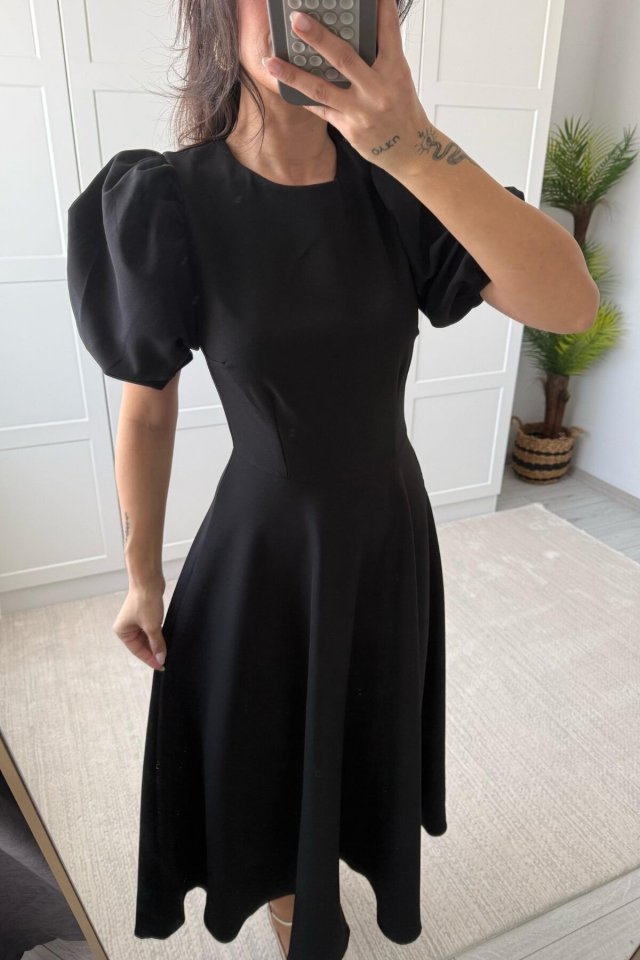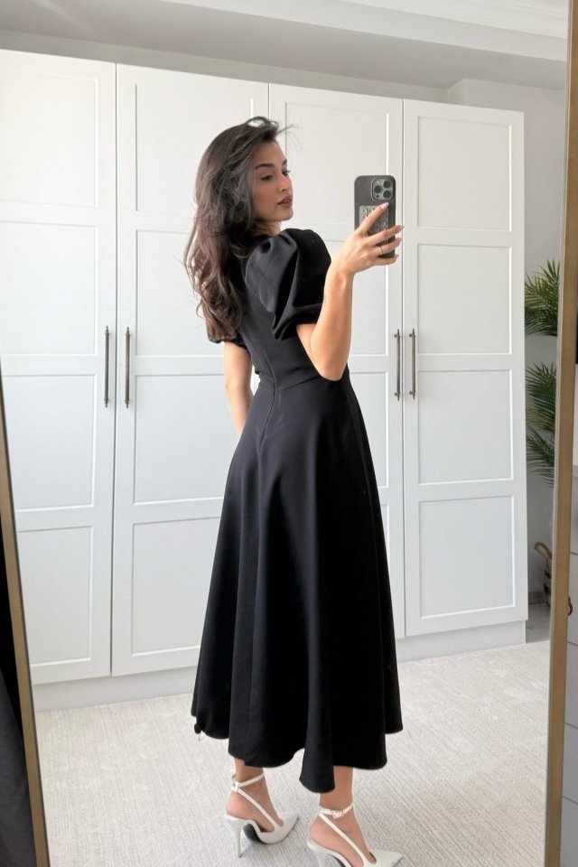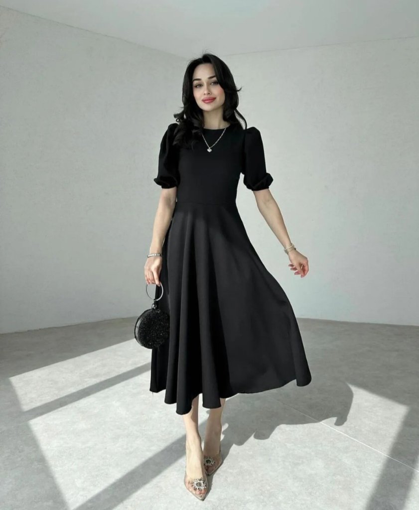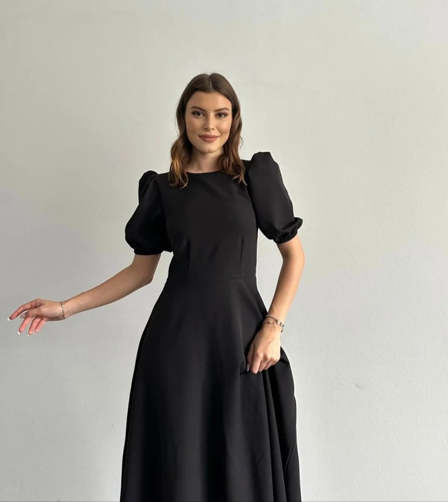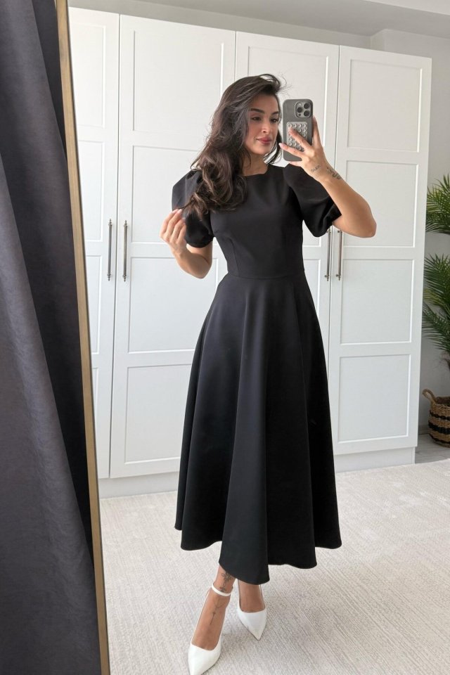 Kadın Kısa Balon Kollu Bisiklet Yaka Geniş Kesim Janjan Krep Elbise