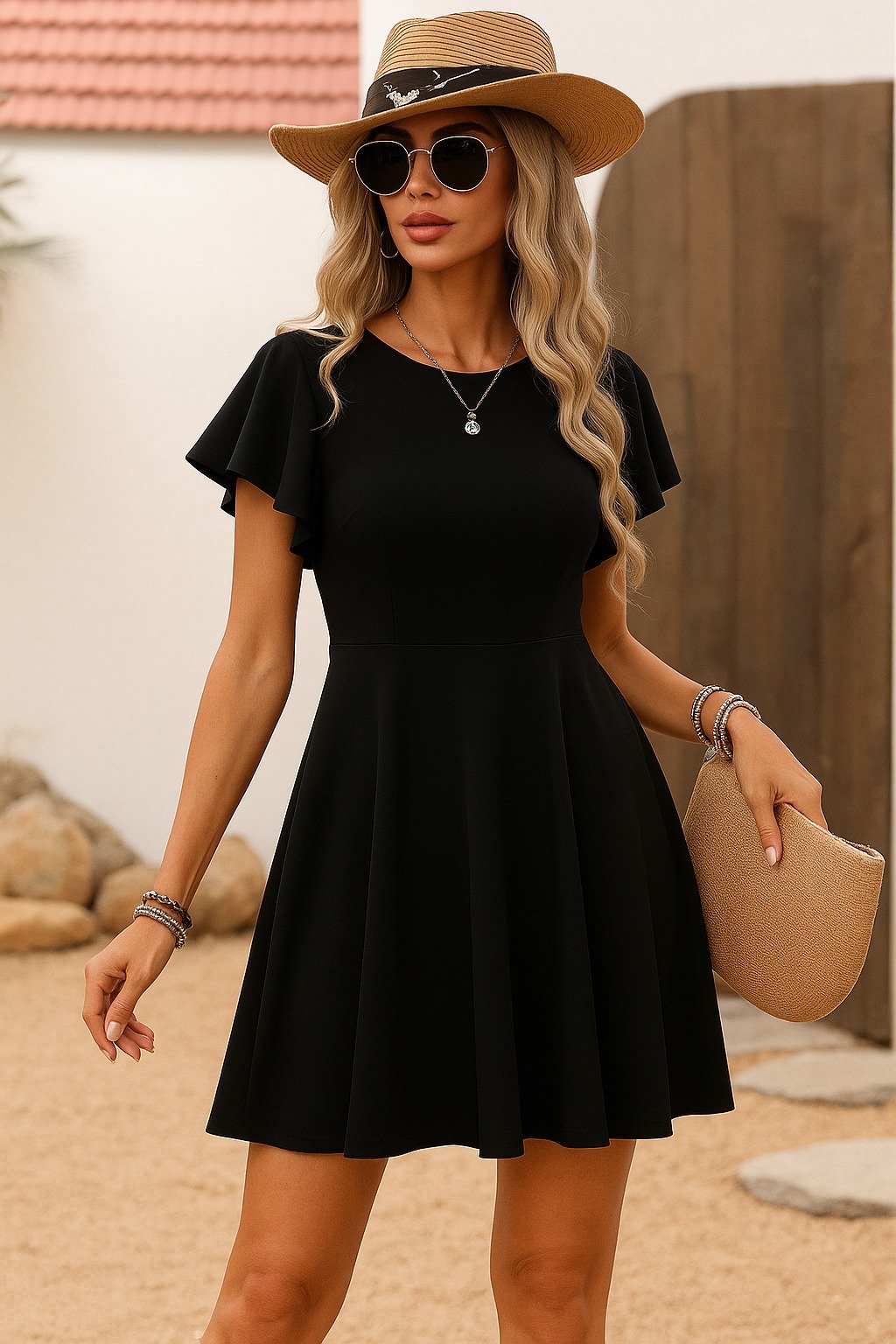 Kadın Kısa Kelebek Kollu Bisiklet Yaka Janjan Krep Elbise