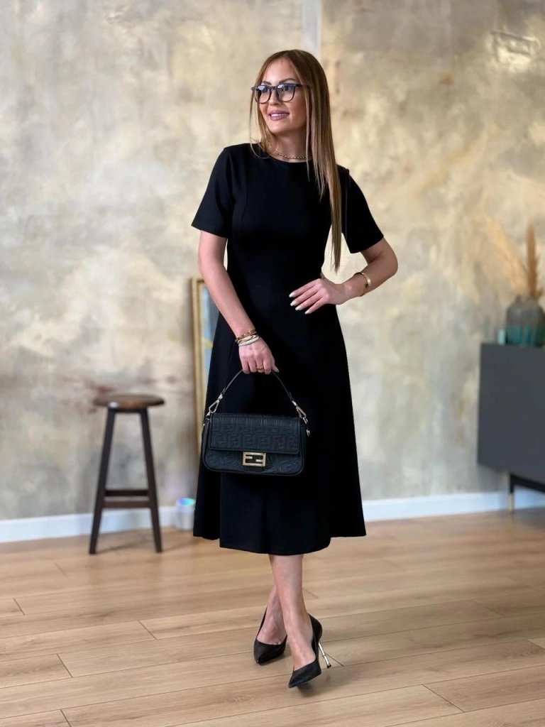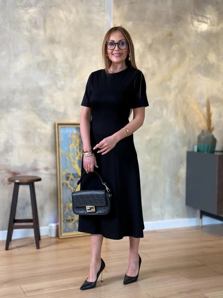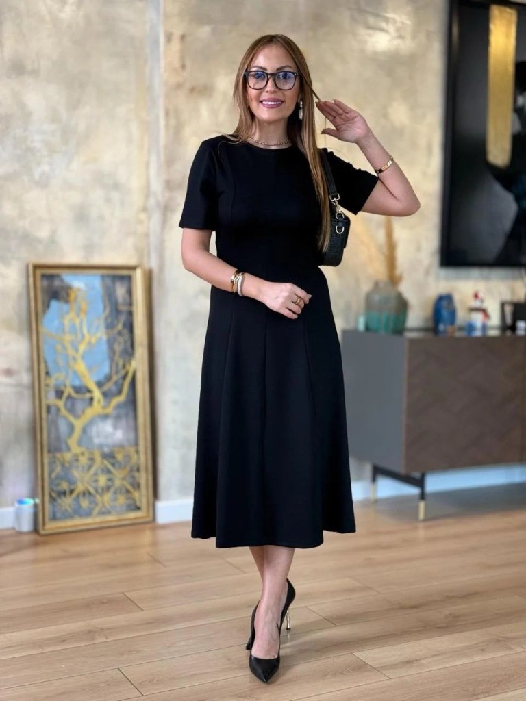 Kadın Kısa Kollu Bisiklet Yaka Midi Viskon Iki Iplik Elbise