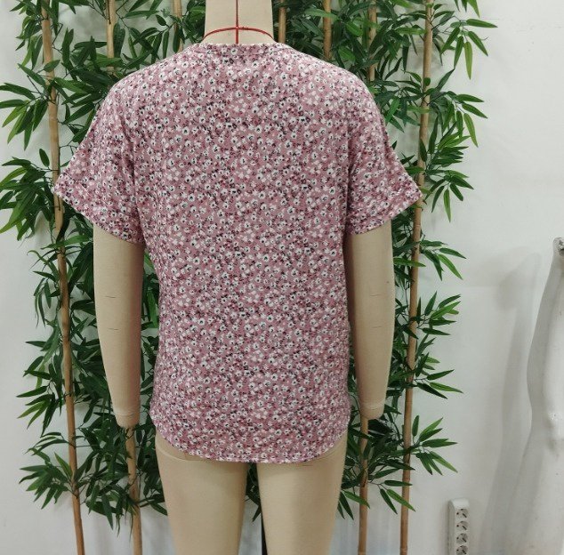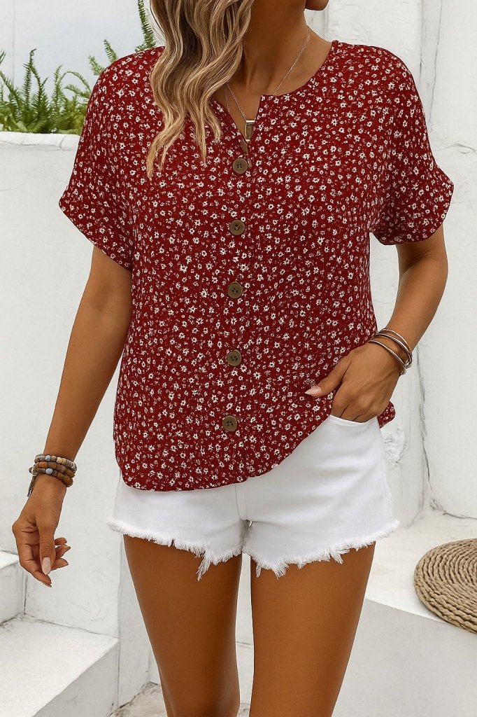 Kadın Kısa Kollu çentikli V Yaka Ve Düğme Detaylı çiçek Desenli Süprem Bluz