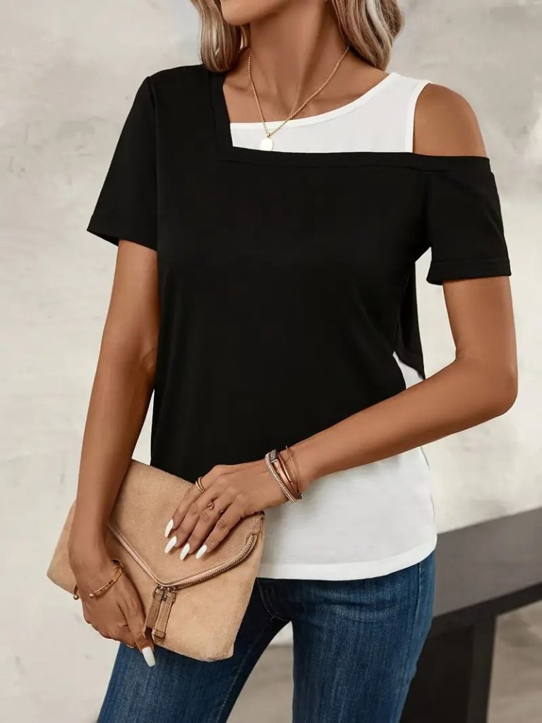 Kadın Kısa Kollu Geometrik Kesin Detaylı çift Renkli Viskon Bluz
