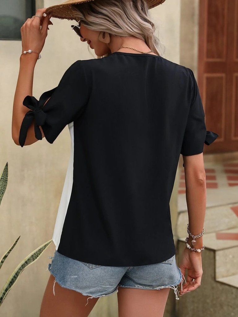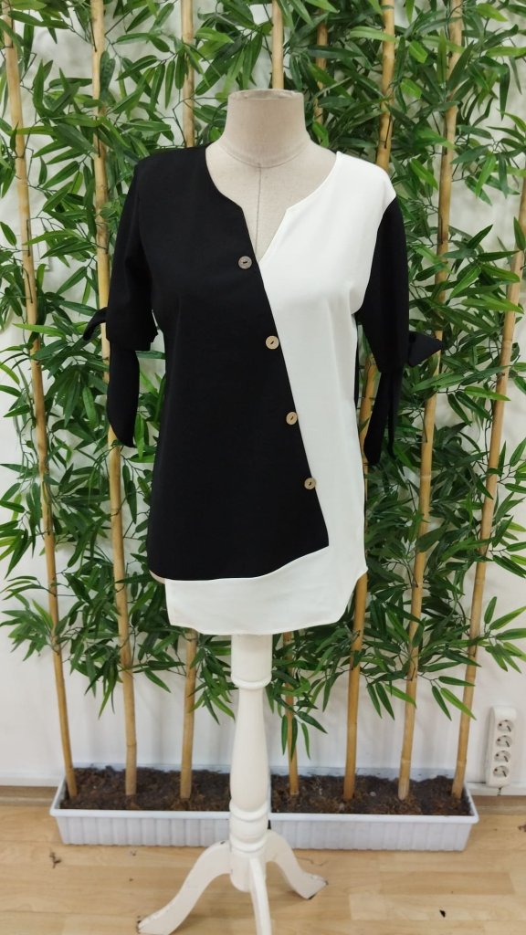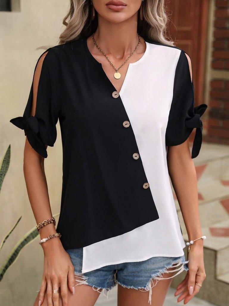 Kadın Kısa Kollu Kollardan Bağlamalı önden Asimetrik Kesim çift Renk Detaylı Düğmeli Ithal Krep Bluz