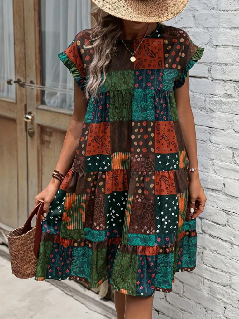Kadın Kısa Kollu Kolları Fırfırlı Bisiklet Yakalı Kare Desenli Elbise