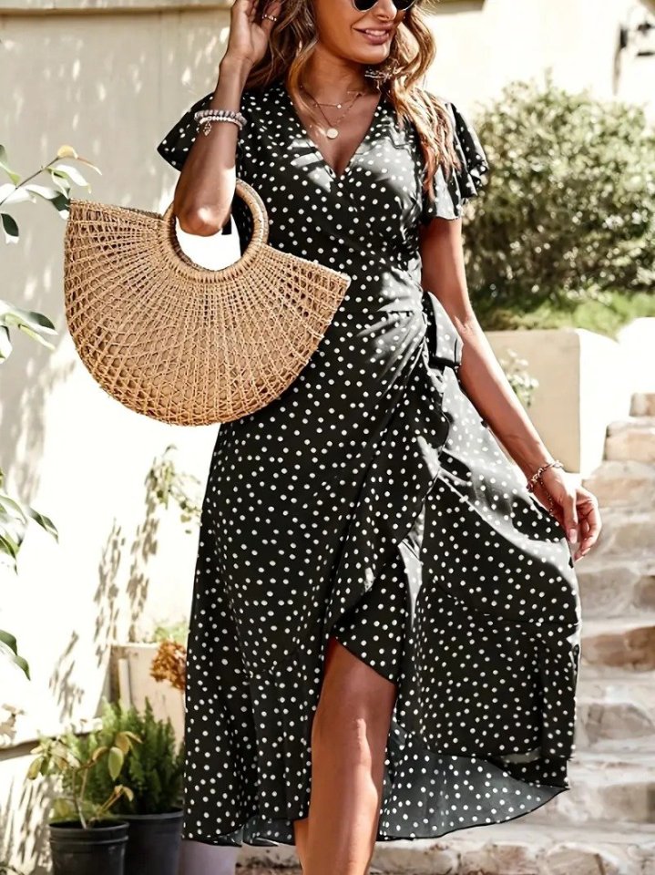 Kadın Kısa Kollu Kruvaze Yaka Yandan Bağlamalı Puantiyeli örme Krep Elbise