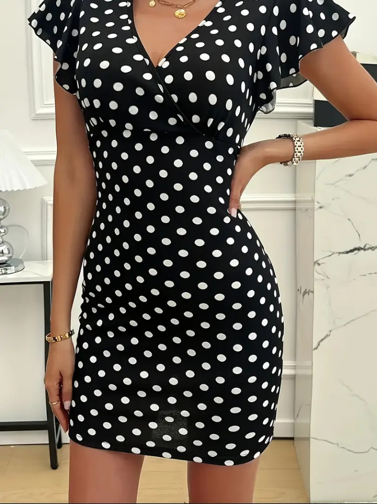 Kadın Kısa Kollu Kruvaze Yakalı örme Puantiyeli Krep Elbise