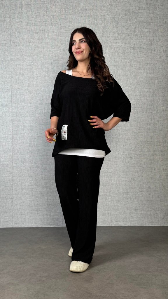 Kadın Kısa Kollu Omuzlardan Açık Yarasa Kollu Bürümcük Bluz Ve Pantolon Ve Viskon Atlet