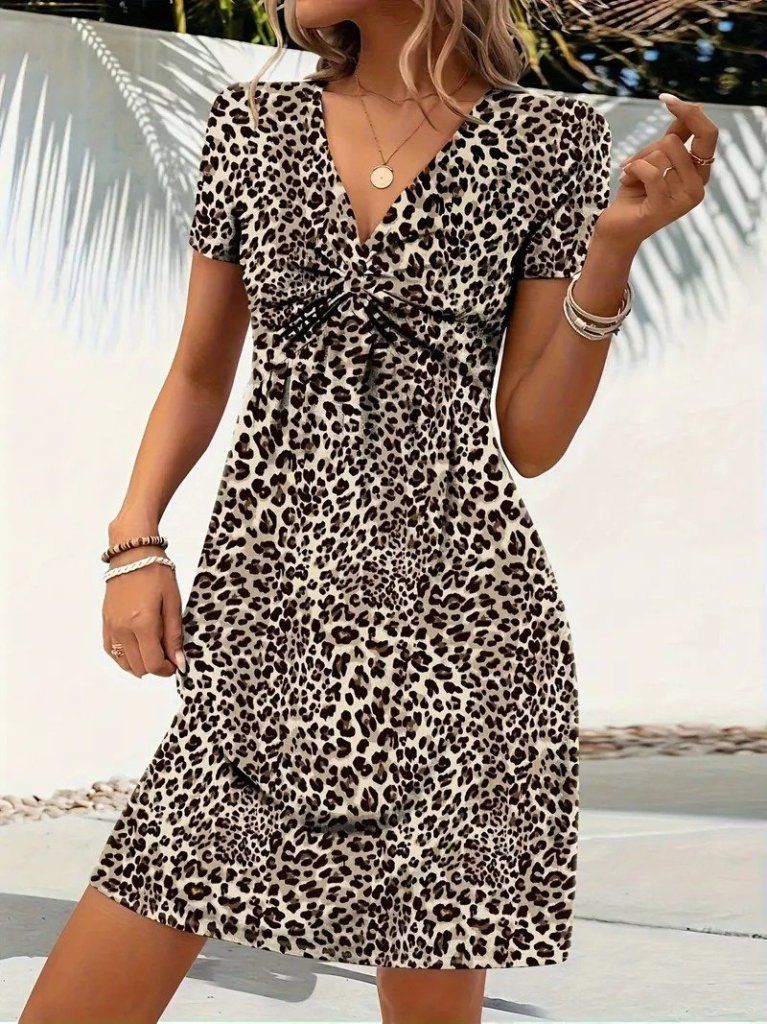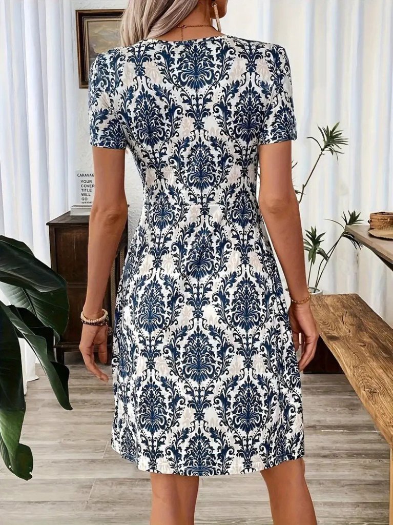 Kadın Kısa Kollu V çapraz Yaka Detaylı Desenli Süprem Elbise