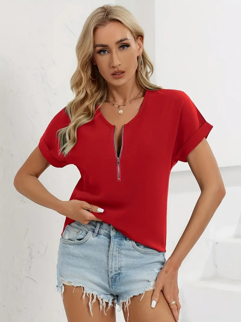 Kadın Kısa Kollu V Yaka Fermuarlı Salaş Sandy Bluz