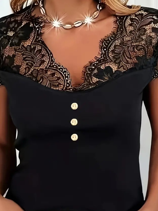 Kadın Kısa Kollu V Yaka önü Düğmeli Dantel Detay Viskon Bluz