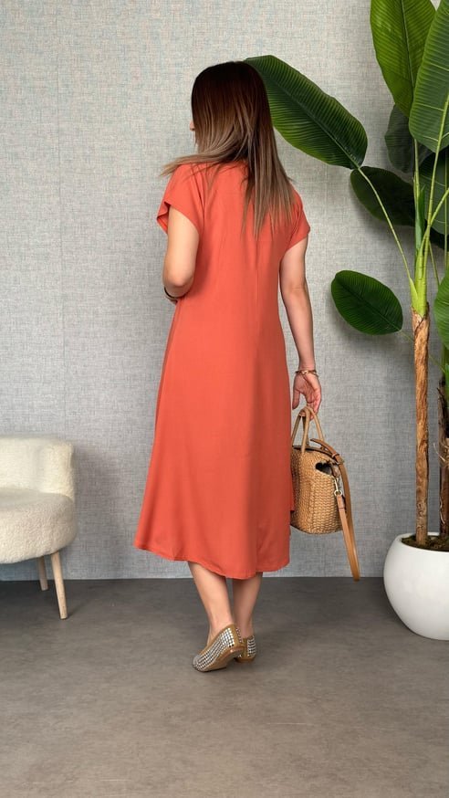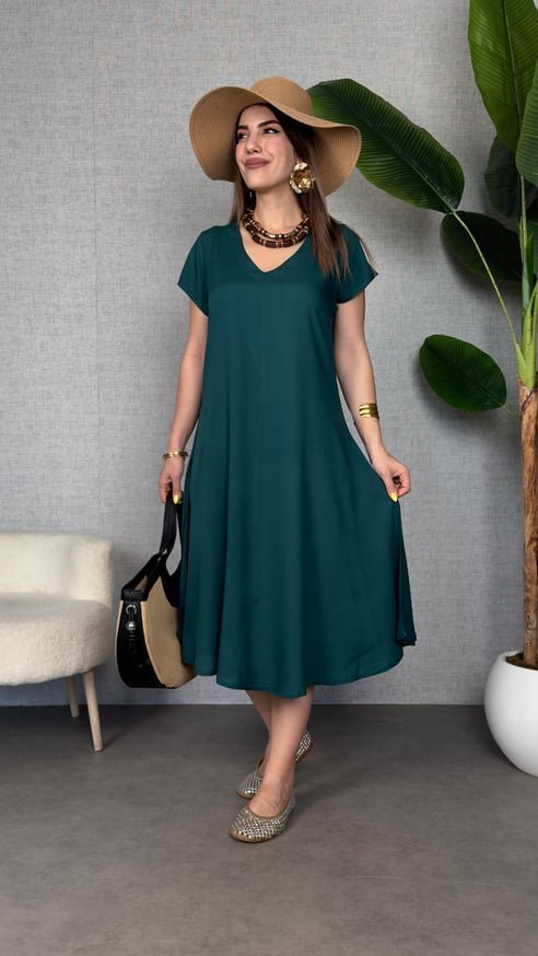 Kadın Kısa Kollu V Yaka Salaş Maxi Boy Elbise