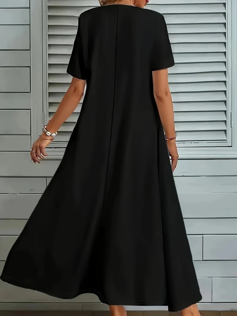 Kadın Kısa Kollu V Yakalı Cep Detaylı Uzun Janjan Krep Elbise