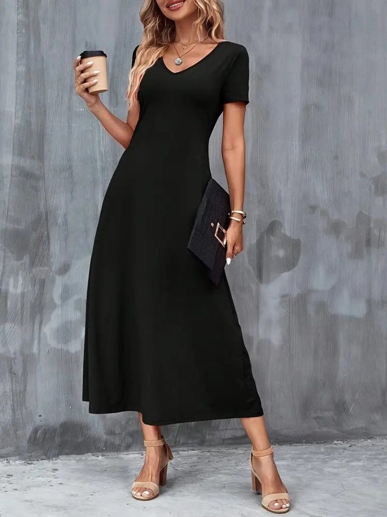 Kadın Kısa Kollu V Yakalı Cepli Viskon Elbise