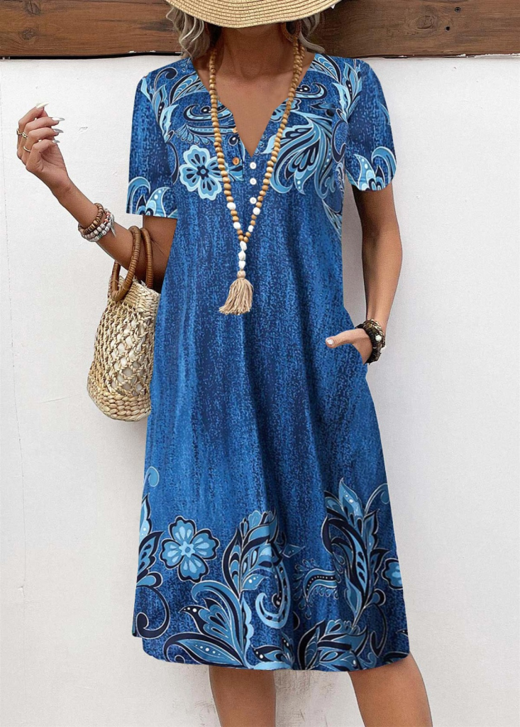 Kadın Kısa Kollu V Yakalı çiçek Baskılı Midi Süprem Elbise