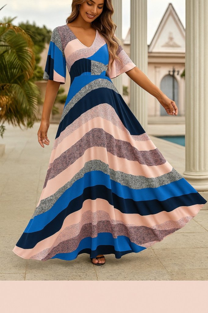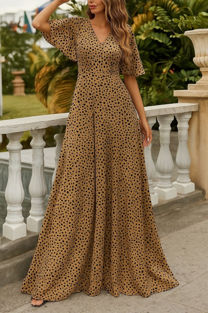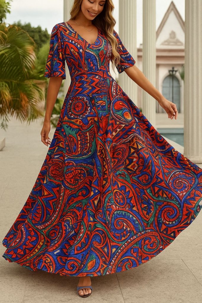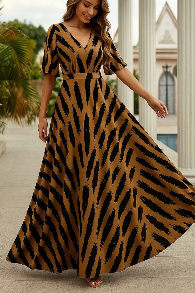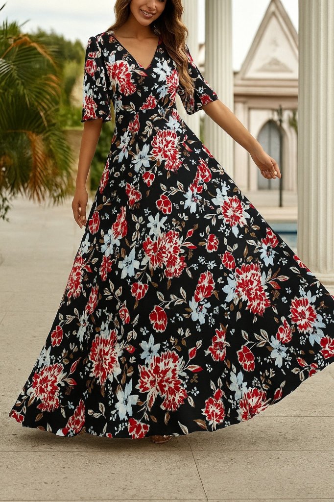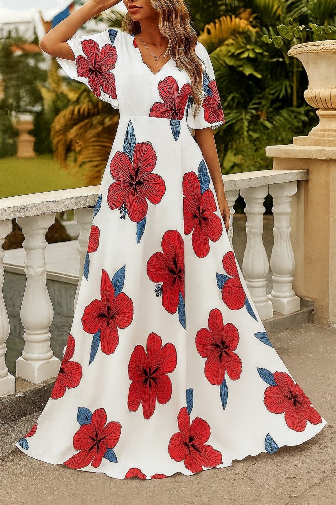 Kadın Kısa Kollu V Yakalı çiçek Desenli Süprem Elbise