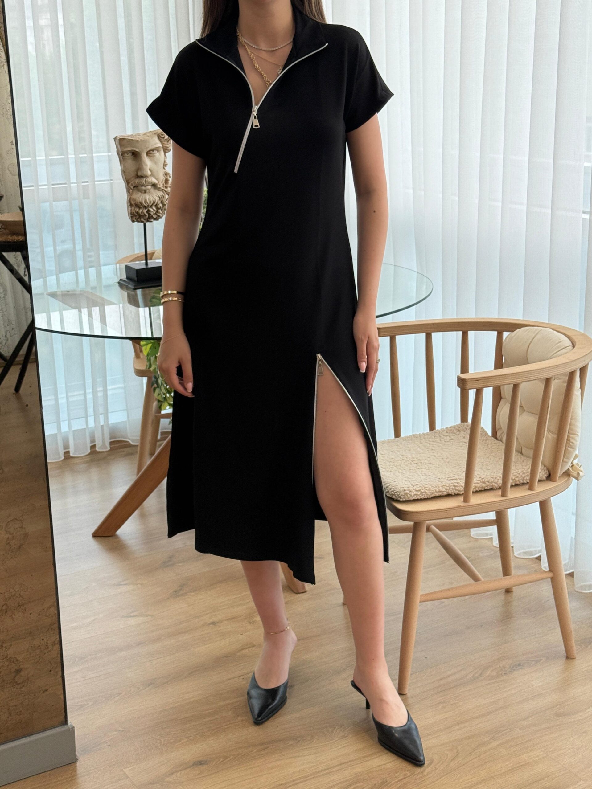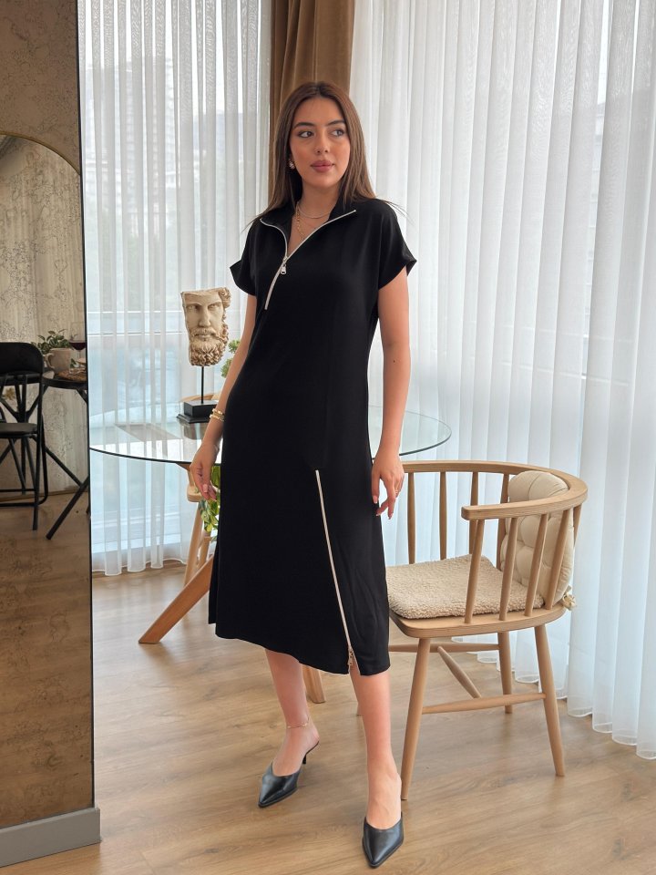 Kadın Kısa Kollu Yakadan Ve Etekten Fermuarlı Midi Viskon Iki Iplik Elbise