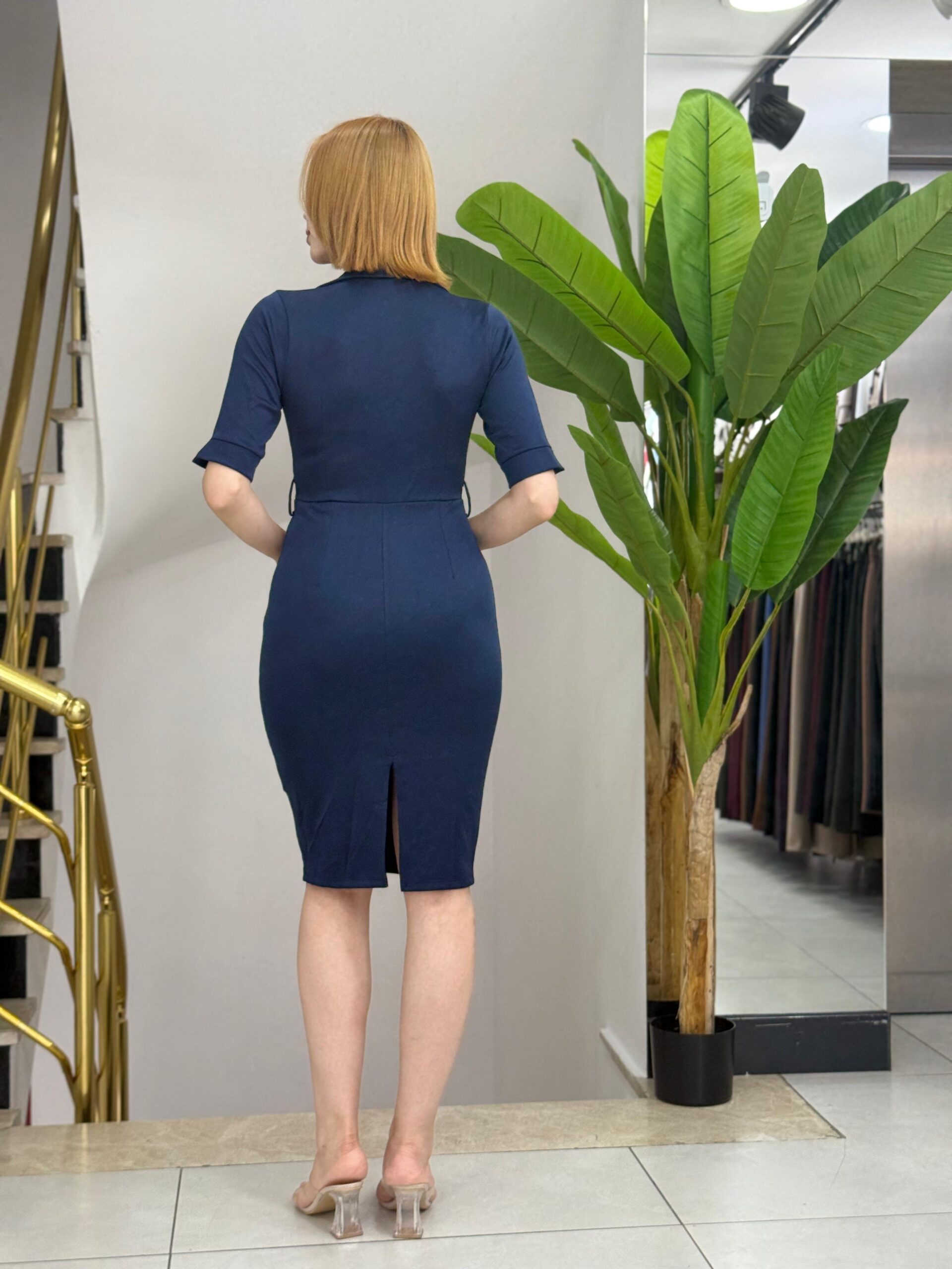 Kadın Kısa Kollu Yakalı Kruvaze Yakalı Beli Kemerli Midi Modal Elbise