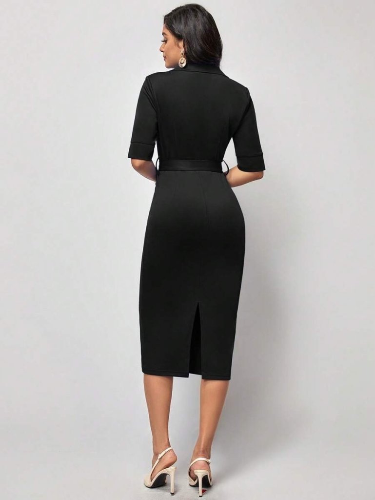 Kadın Kısa Kollu Yakalı Kruvaze Yakalı Beli Kemerli Midi Modal Elbise