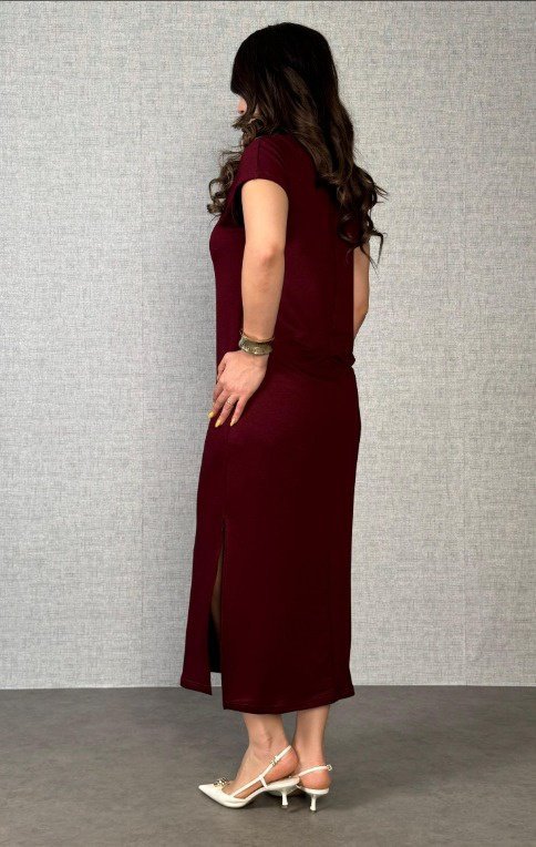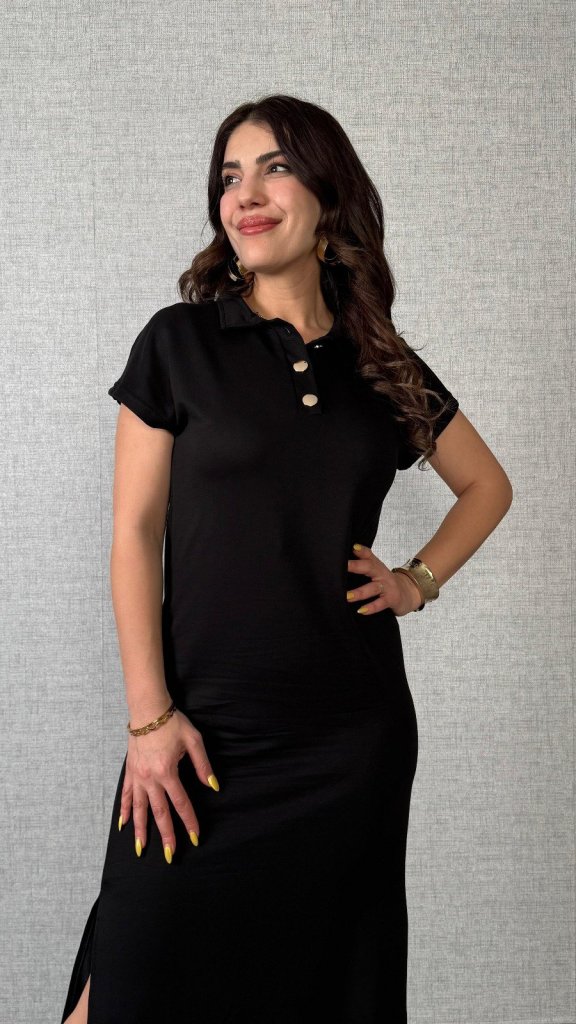 Kadın Kısa Kollu Yakalı Yandan Yırtmaçlı Viskon Iki Iplik Elbise