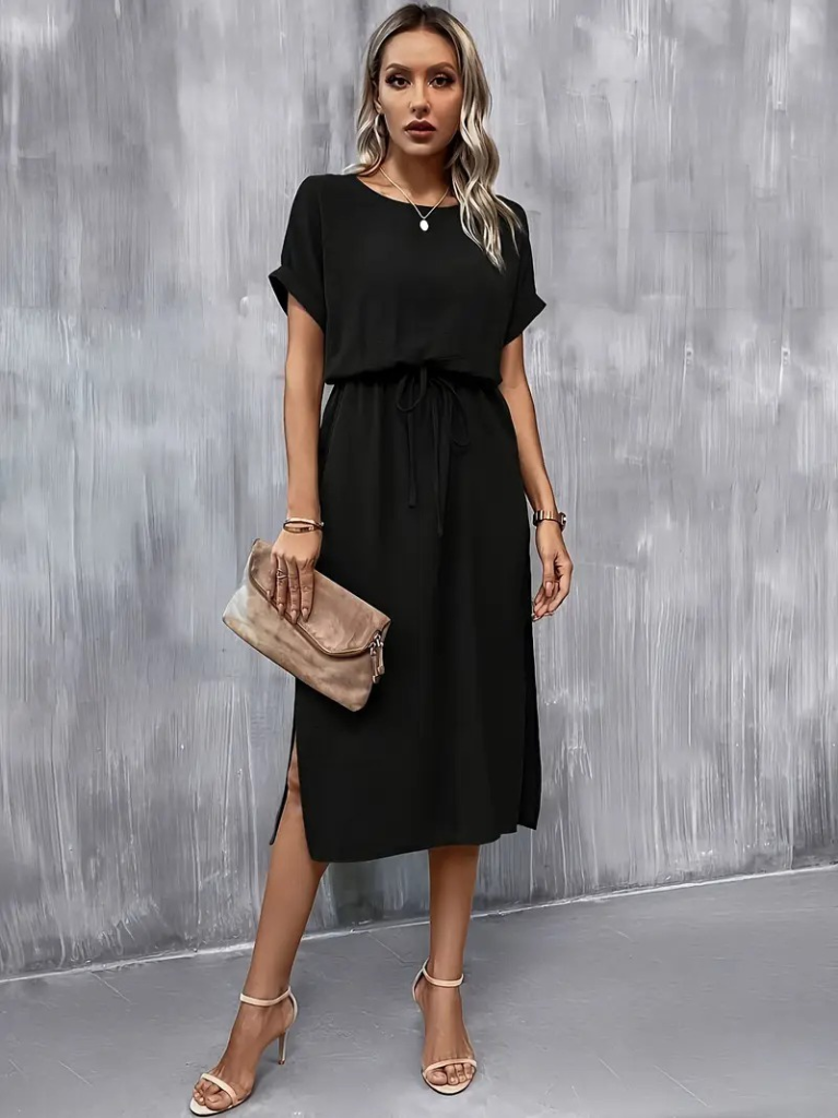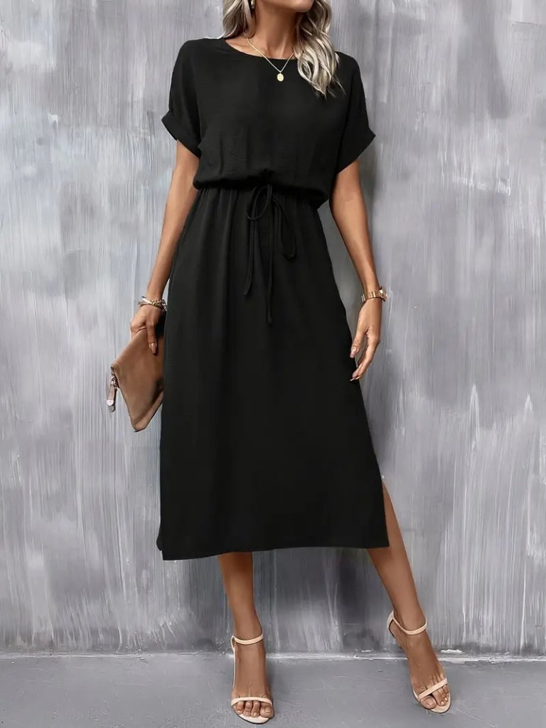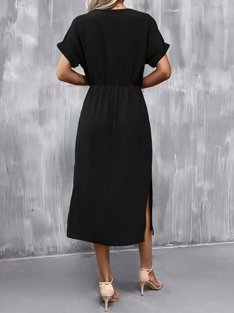 Kadın Kısa Kollu Yakası Açık Belden Bağlamalı Yırtmaçlı Viskon Elbise