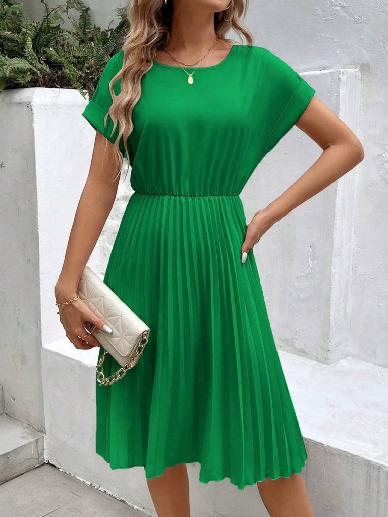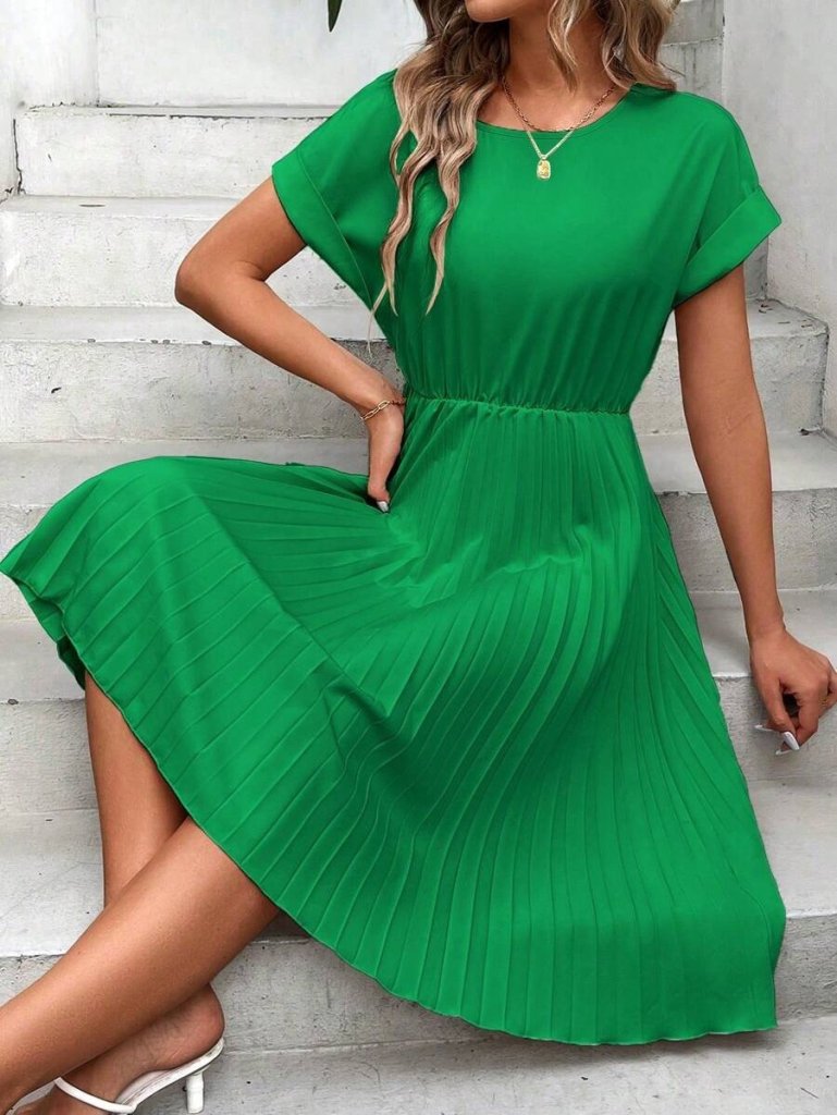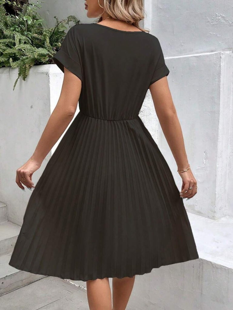 Kadın Kısa Kollu Yakası Açık Belden Lastikli Pileli Kısa Ithal Krep Elbise