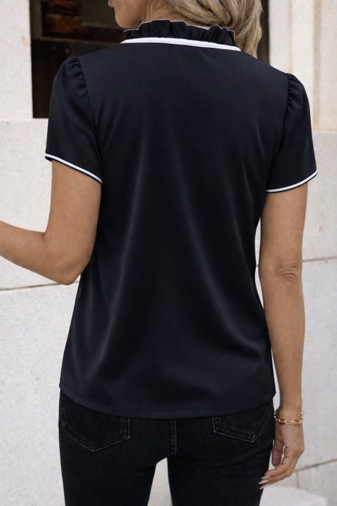 Kadın Kısa Kollu Yakası Fırfırlı Bağcıklı Janjan Krep Bluz