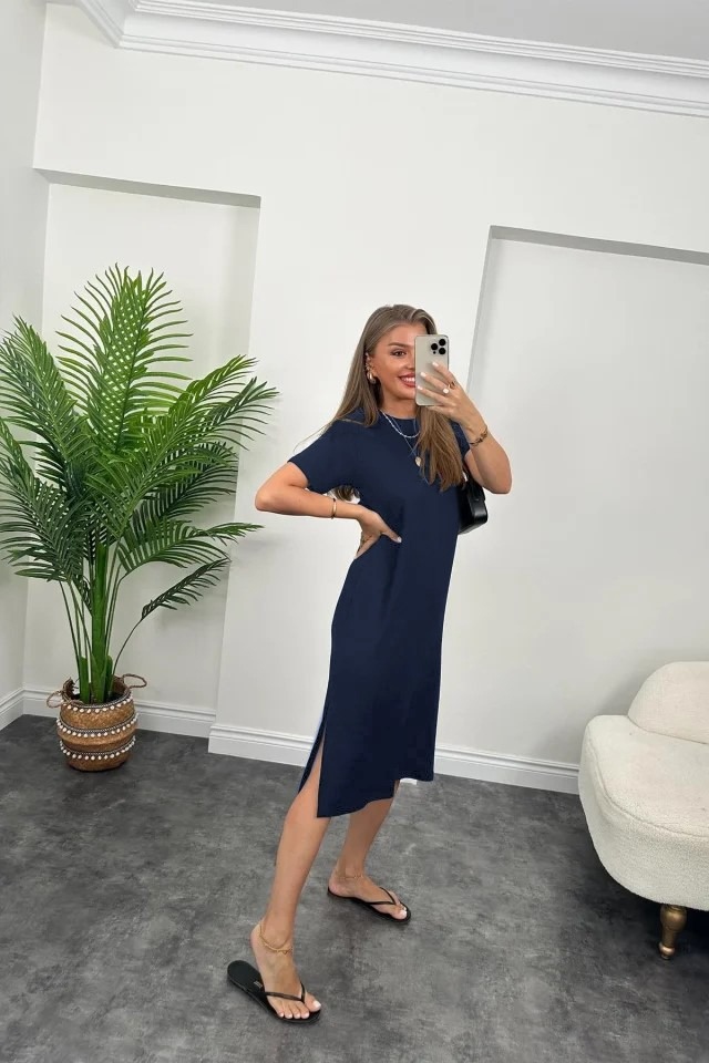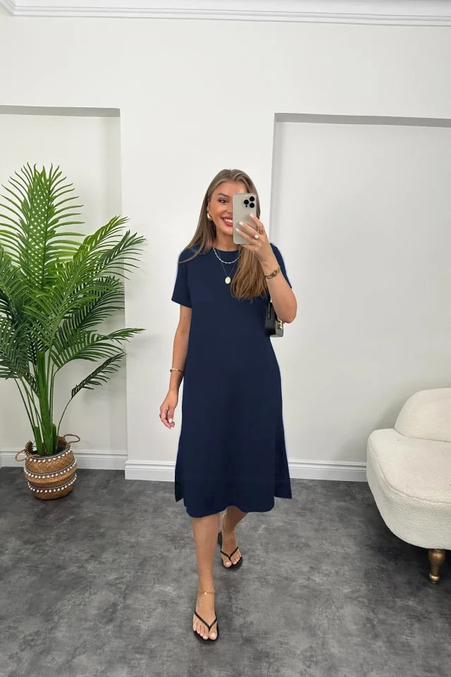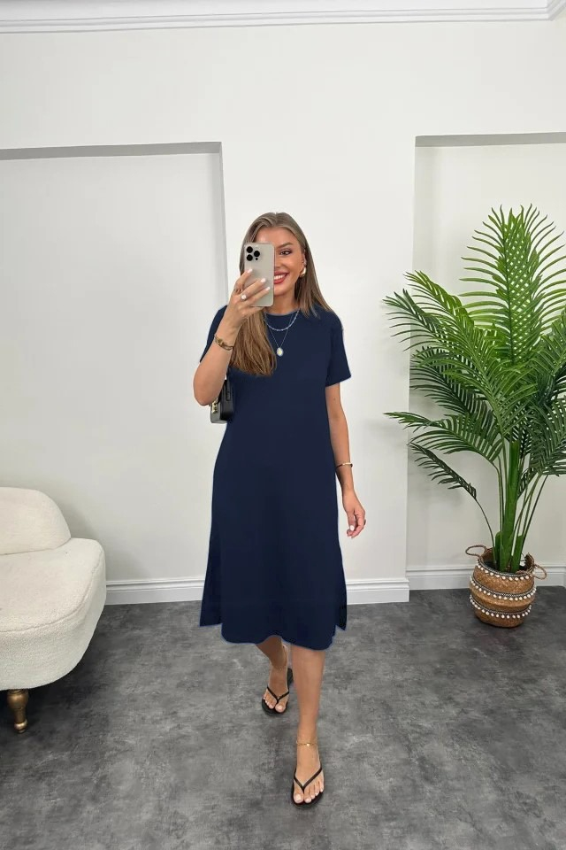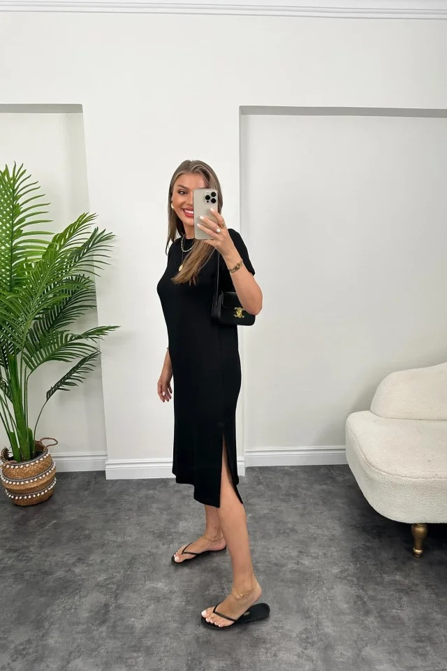 Kadın Kısa Kollu Yırtmaç Detaylı Salaş Viskon Elbise