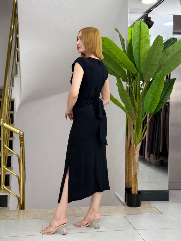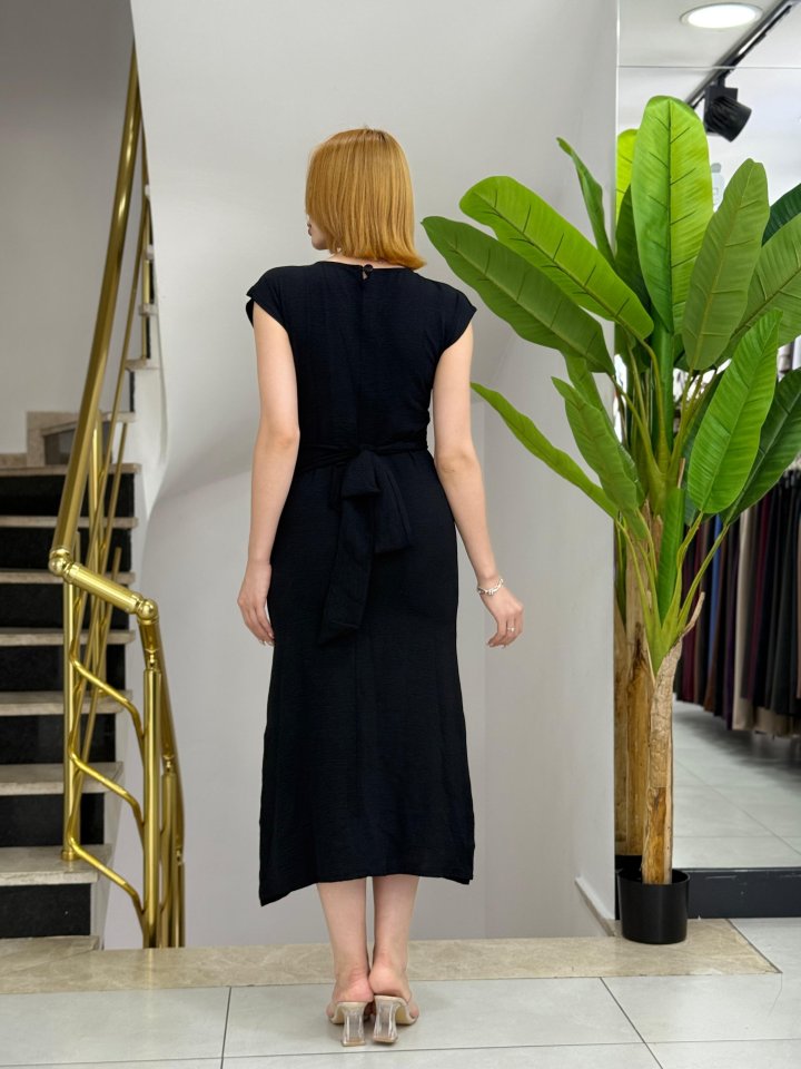 Kadın Kısa Kollu Yuvarlak Yaka Belden Bağcıklı önden Yırtmaçlı Aerobin Elbise