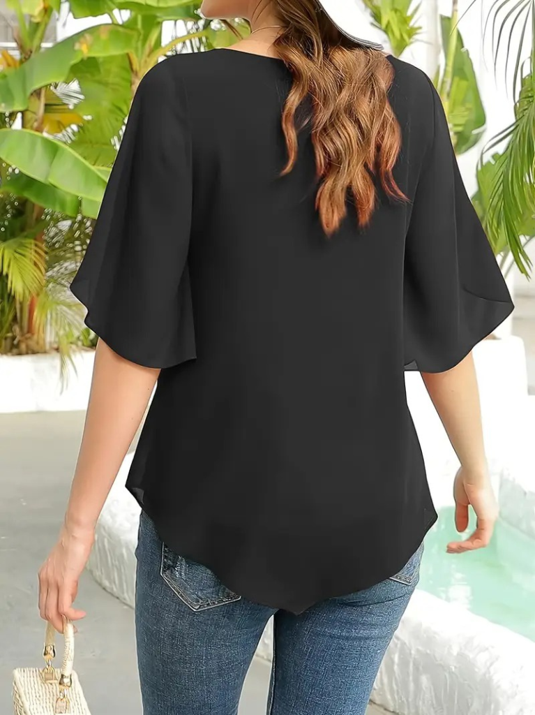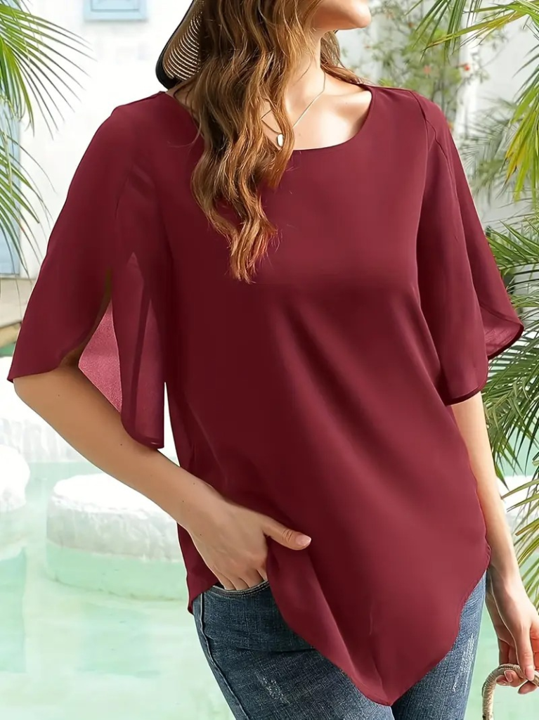 Kadın Kısa Yırtmaç Kollu Yuvarlak Yaka şifon Bluz