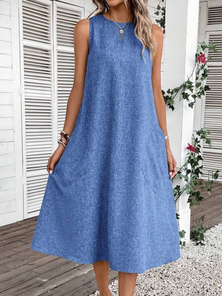 Kadın Kolsuz Bisiklet Yaka Cepli Midi Keten Elbise