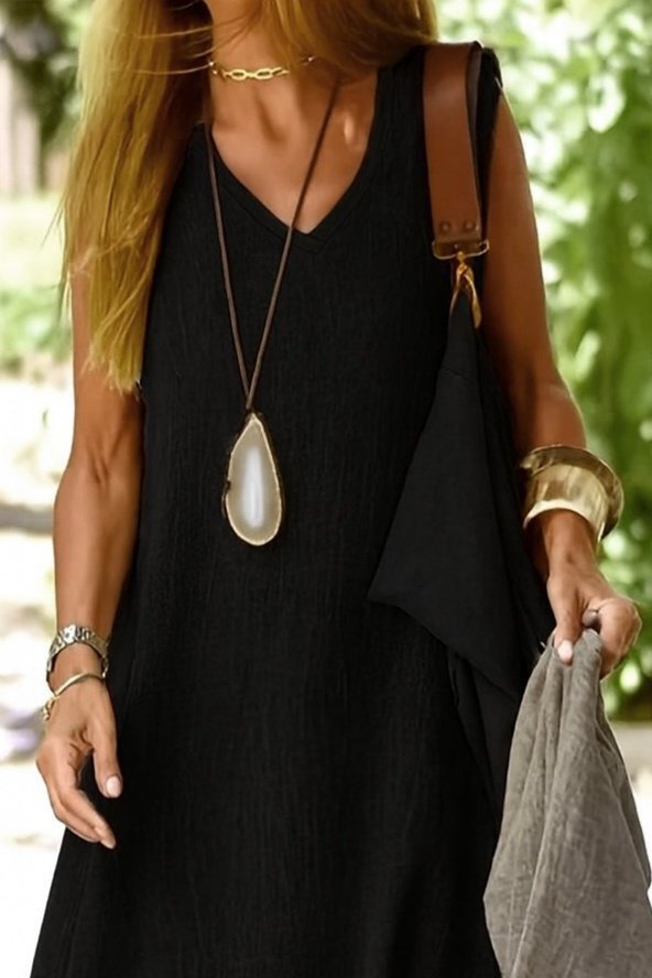Kadın Kolsuz V Yakalı Maksi Boy Ithal Keten Elbise