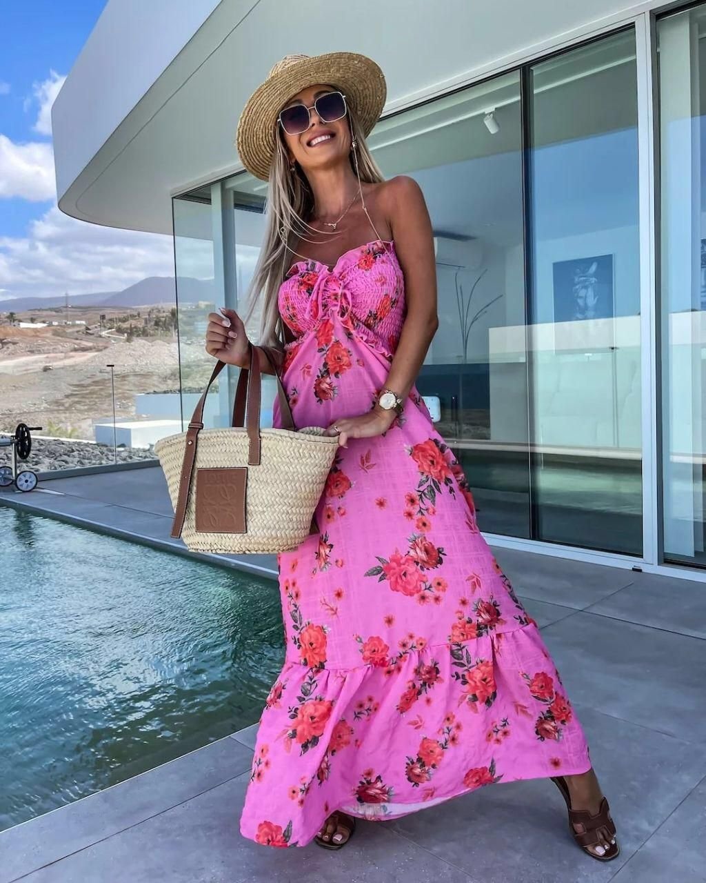 Kadın Krep Kumaş çiçek Desenli önünde Büzgü Detaylı Maxi Boy Elbise