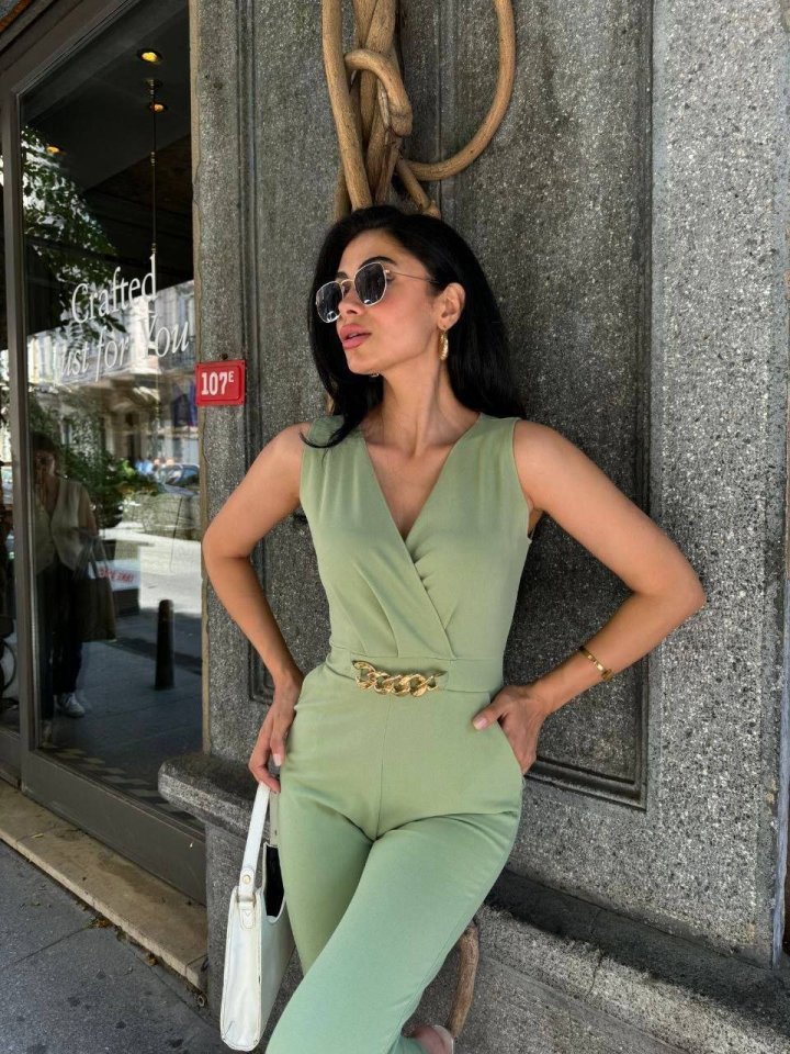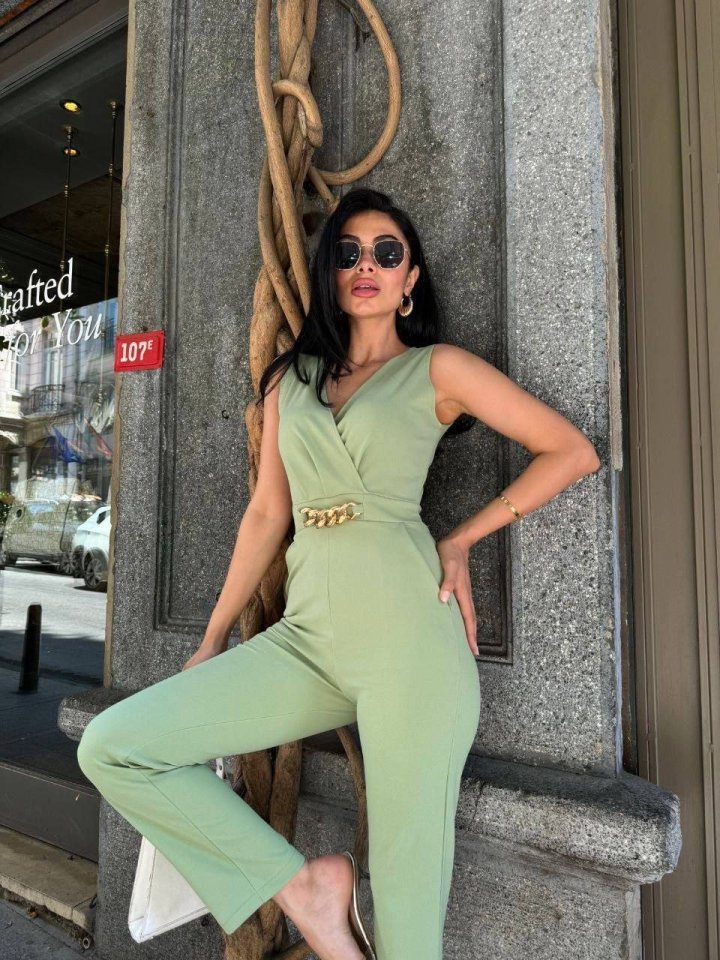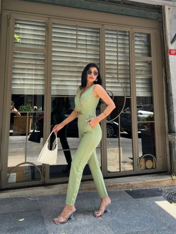 Kadın Kruvaze Yaka Kemer Detaylı Scuba Krep Tulum