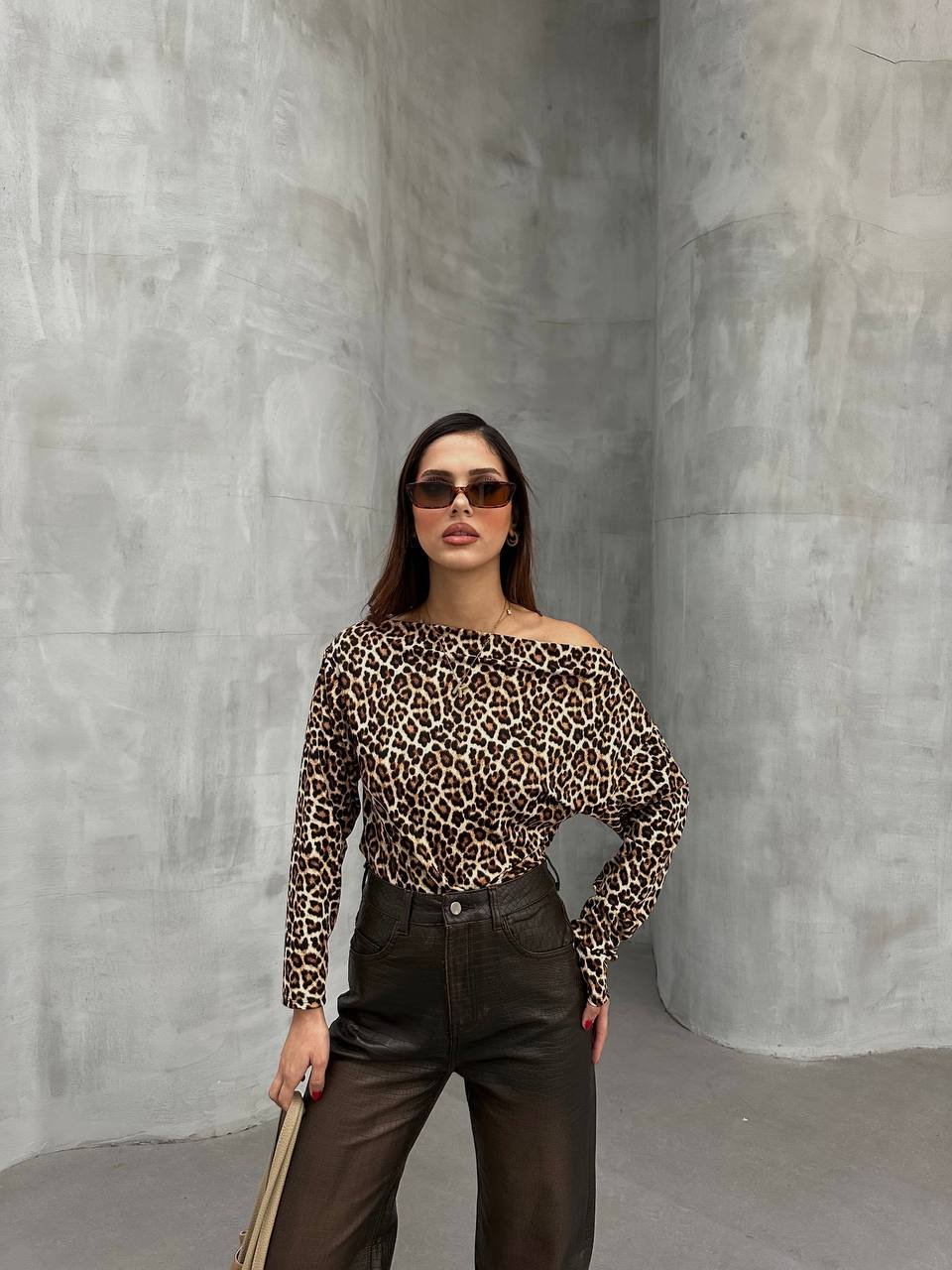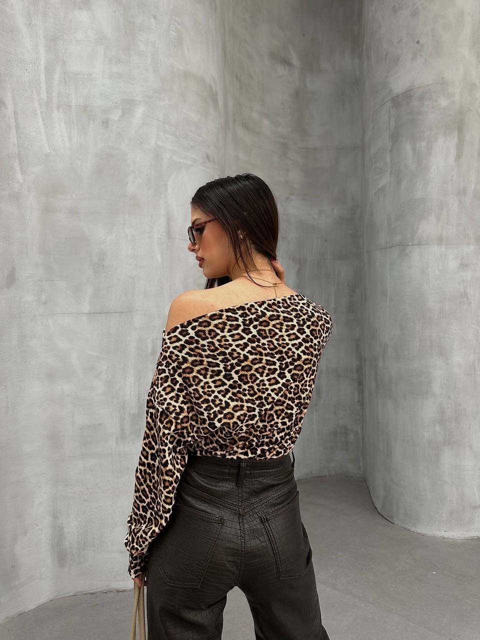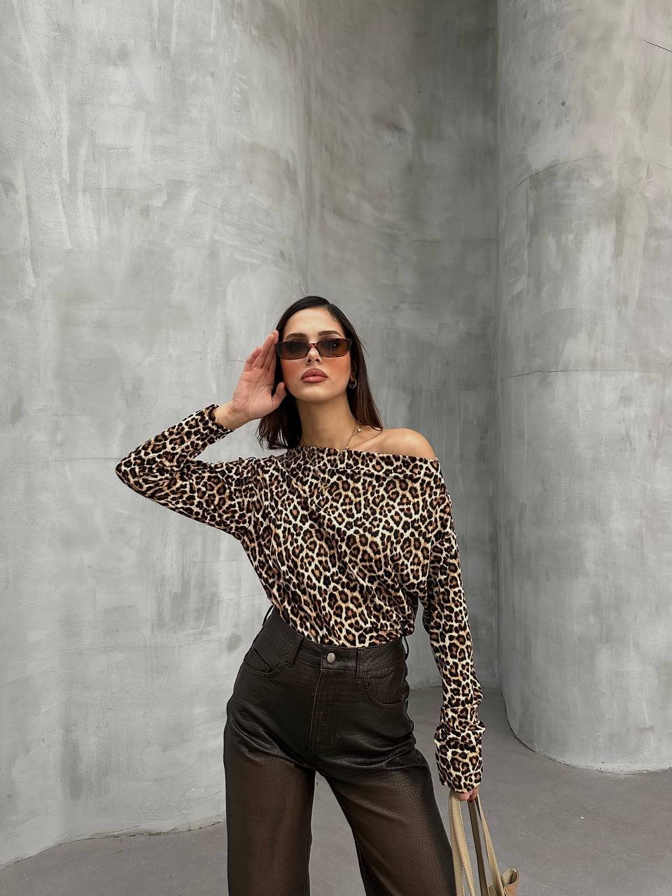 Kadın Leopar Desenli Düşük Omuzlu Bluz