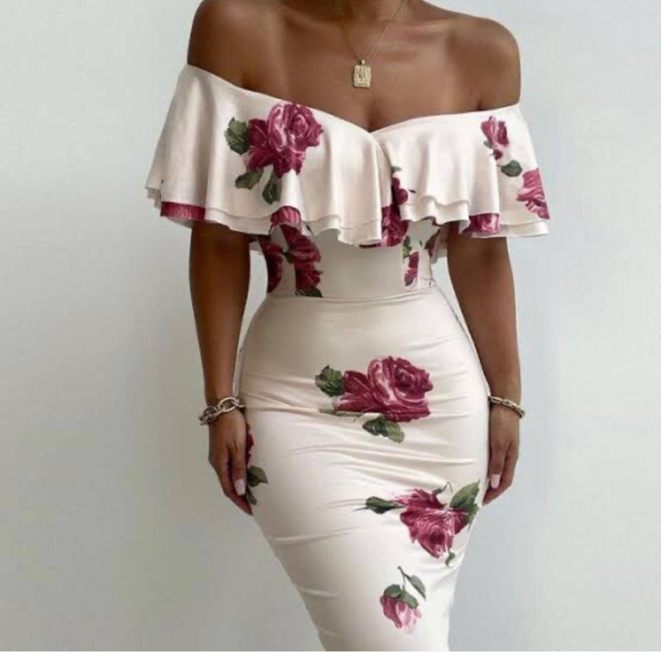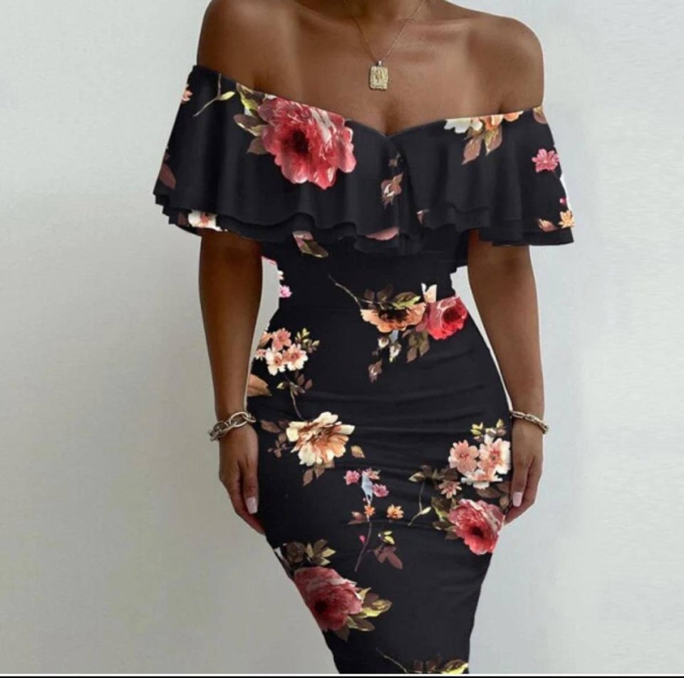 Kadın Madonna Yaka çiçek Baskılı Volan Detay Kalem Elbise